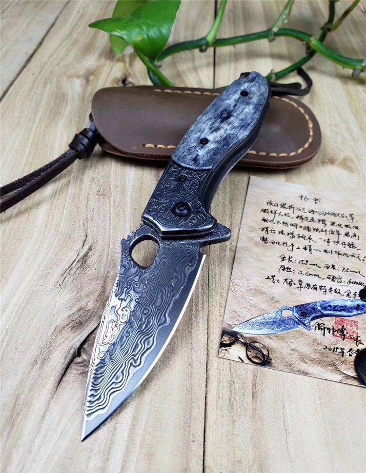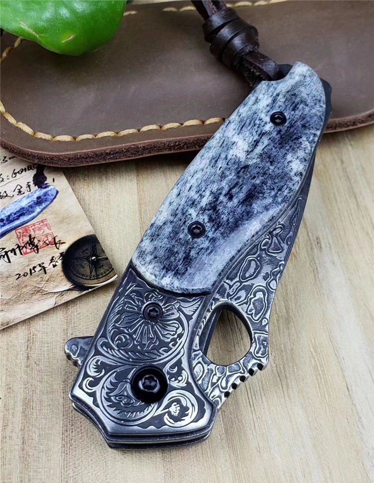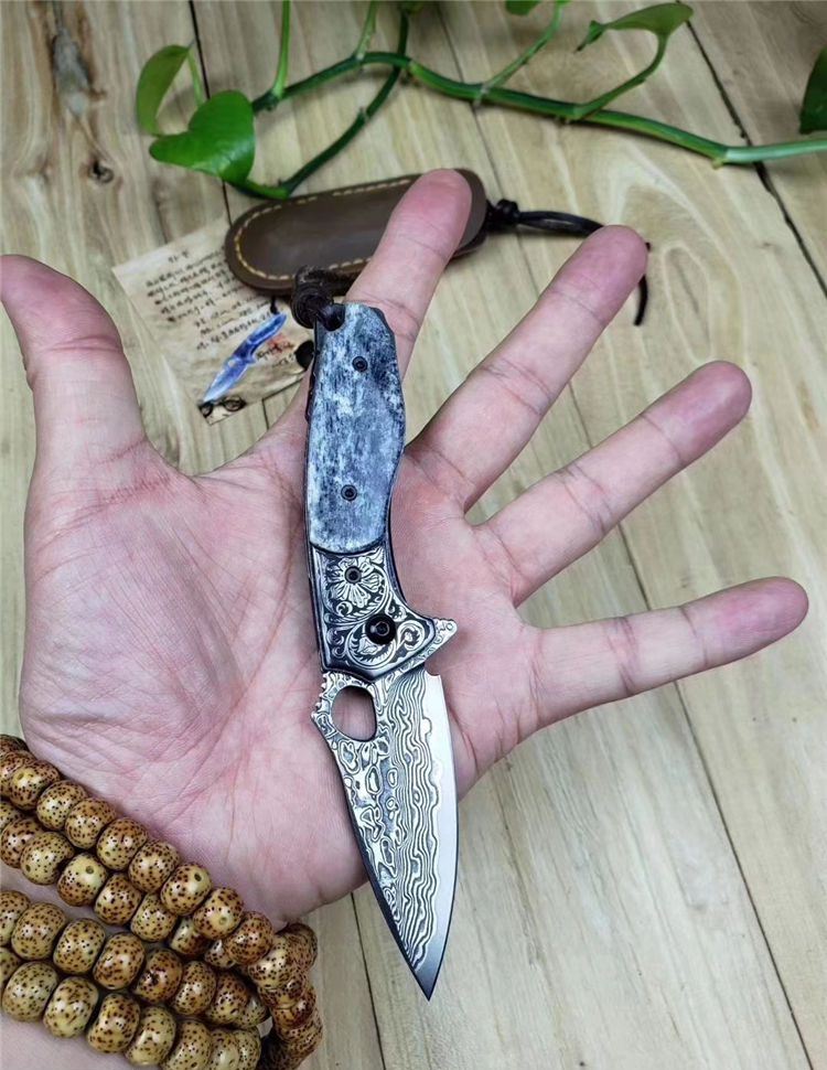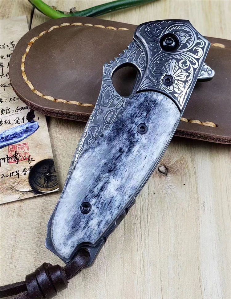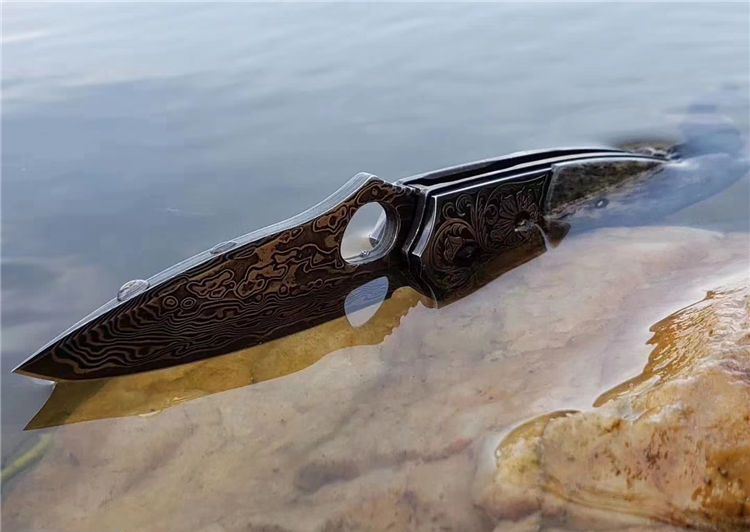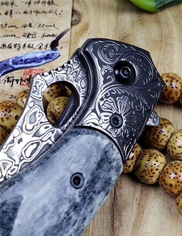 静静的湖面一只黑鳄悄悄的浮出水面,硕大的眼睛注视着前方,慢慢的向猎物靠近..黑鳄折刀选用4mm厚VG10刃钢大马士革锻打祥云纹,经多道打磨刀刃厚度达到3.6mm,刀隔不锈钢刻原创唐草图案,刀柄精选老牛骨精细打磨抛光,黑化做旧工艺,不锈钢底骨手工挫花。轴部镶嵌两片高精度滚珠轴承,一体快开鳍,开合顺滑。配置头层牛皮手工缝制皮套,赠送简师傅收藏证书,此把【黑鳄】折刀做工精细,形象生动,宽厚的刀刃犹如黑鳄鱼的头部,悄悄的从草丛中探出头来,乌黑发亮的身体拖着一条长长的尾巴