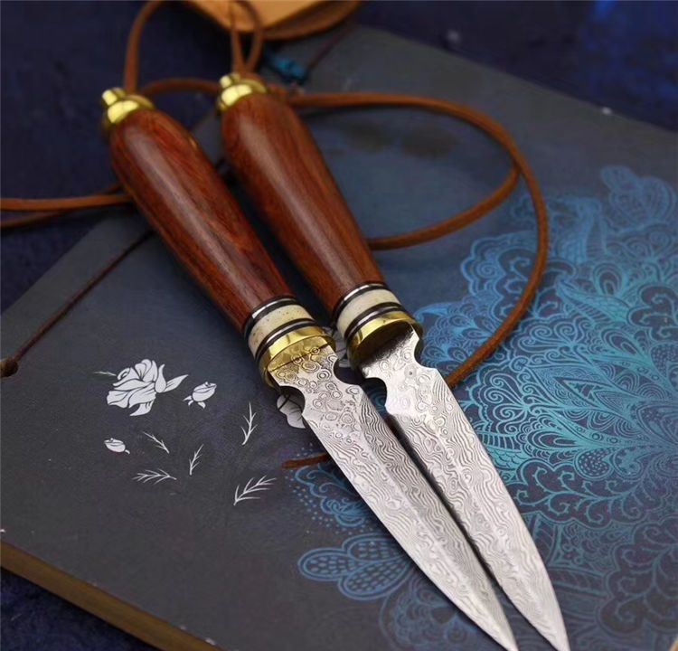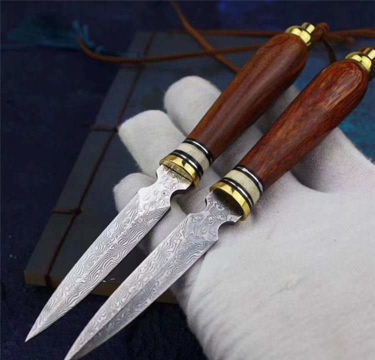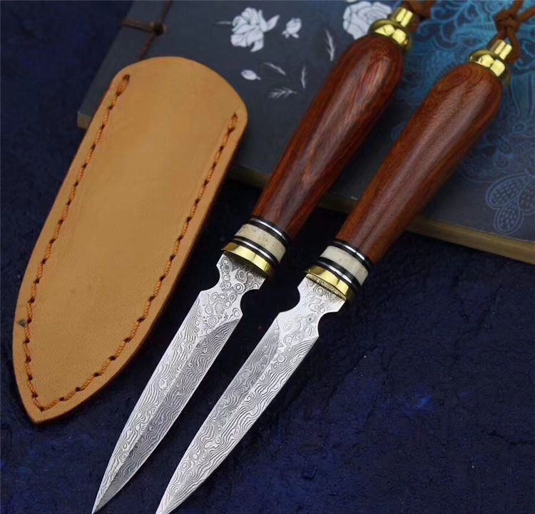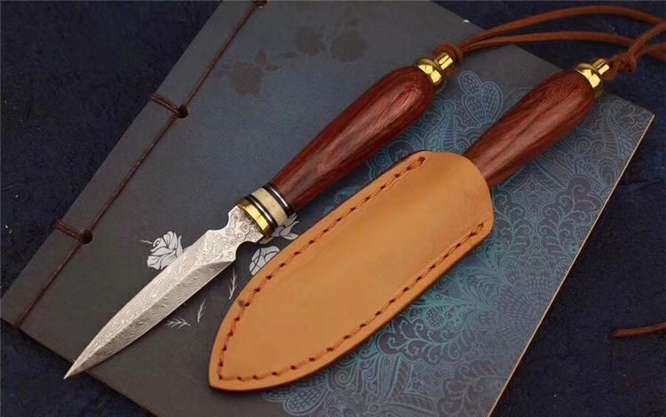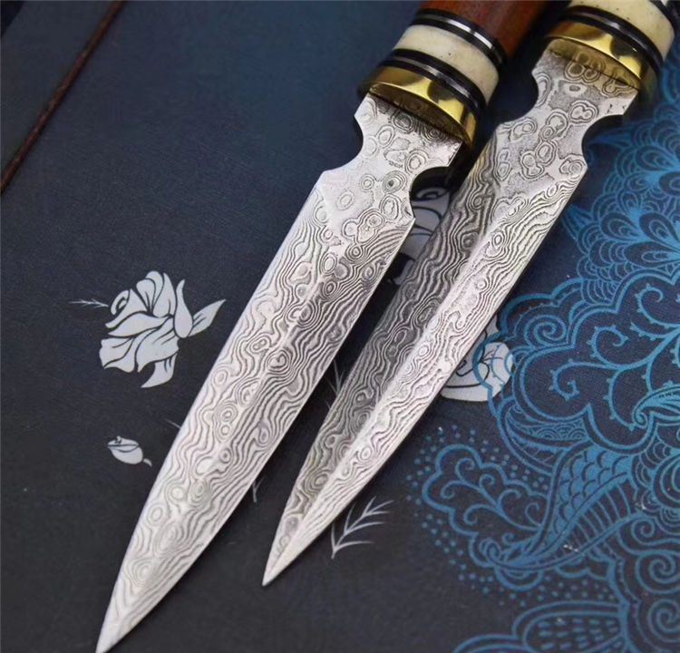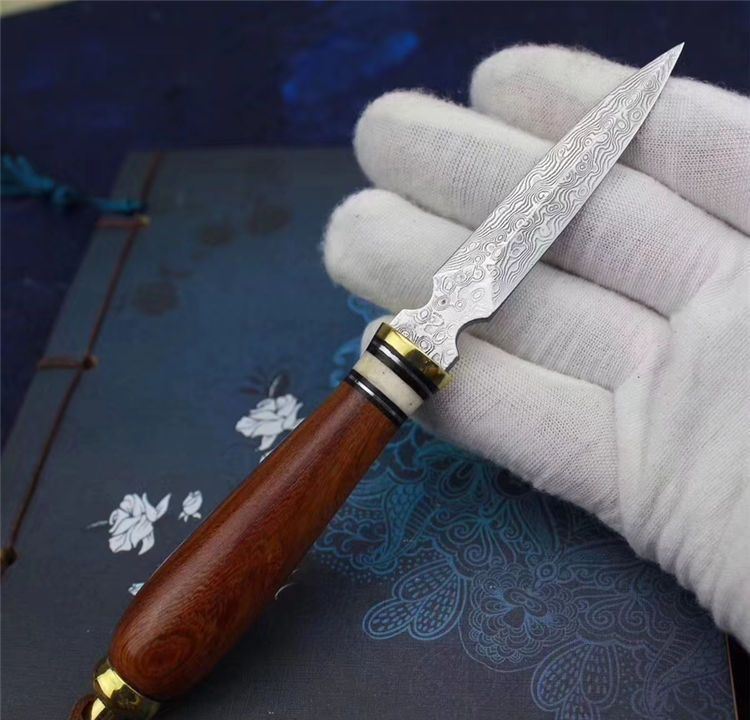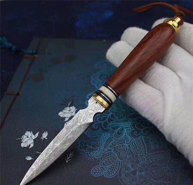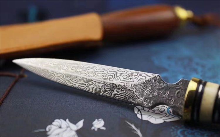 新款萧大马士革茶刀 全长:17cm 刃长:7.6cm 柄长:9.5cm 刃材:无钢芯大马士革钢(85层) 刃厚:3mm 刃最宽处:1.3cm 硬度:58-59HRC 手柄材质:黄铜+精选牛骨+红酸枝木 包装:配高级礼盒+皮套 极致的纯手工制作,款式潇湘大气,采用85层无钢芯大马士革钢,祥云花纹独一无二,钢料厚度3mm、资深老师傅制造出品质量有保证,【萧】是普洱饼茶、砖茶、沱茶等紧压茶的撬取神器佳品送朋友、送领导、家居必备单品