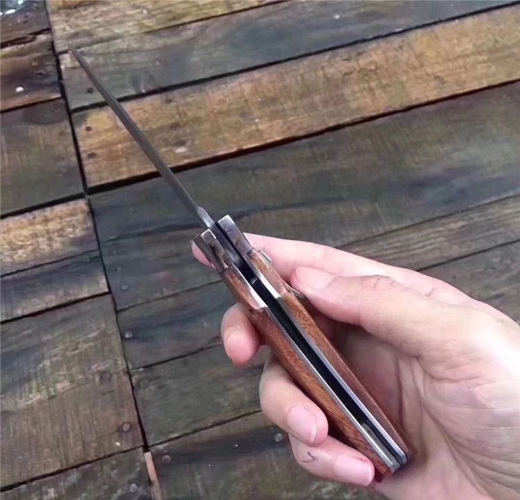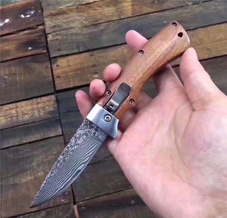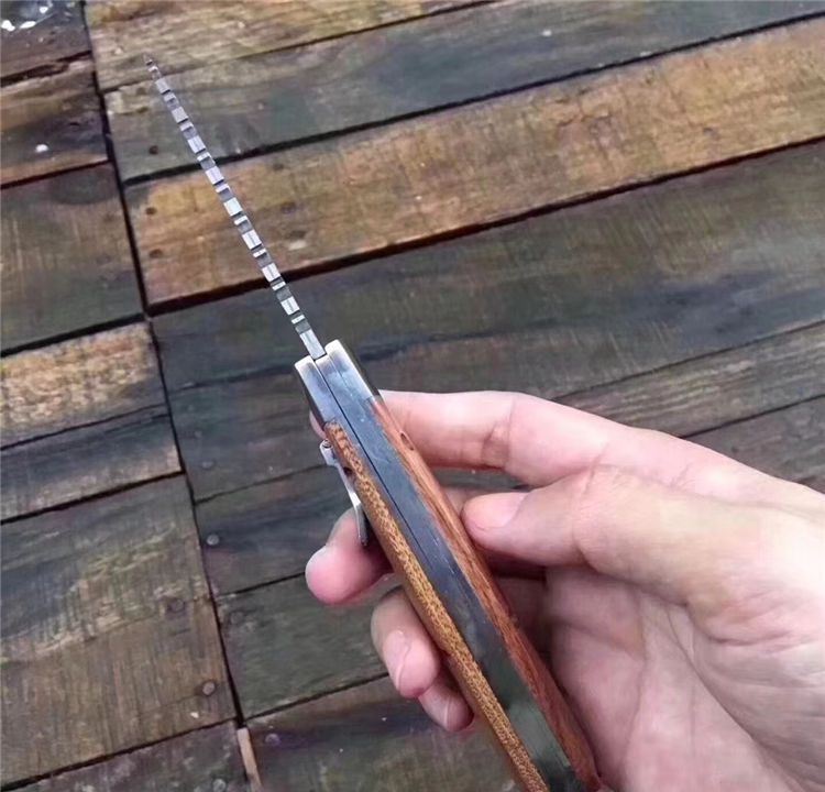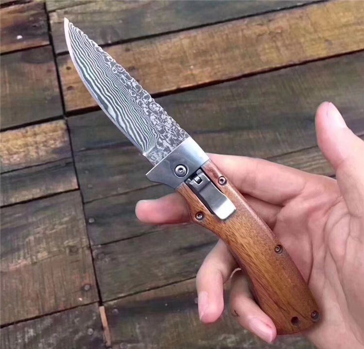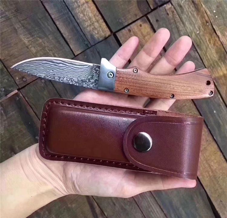 新版大马士革弹弹鱼跳刀 全长:17.7mm 刃长:7.4mm 柄长:10.2mm 刃宽:2.1mm 刃厚:0.25mm 刃材:大马士革钢 重量:171g(含包装) 硬度:58—60HRC 表面:大马士原纹 柄材:钢头+黄檀木 锁型:杠杆纽扣锁定,弹簧快速打开刀刃 其他:牛皮套