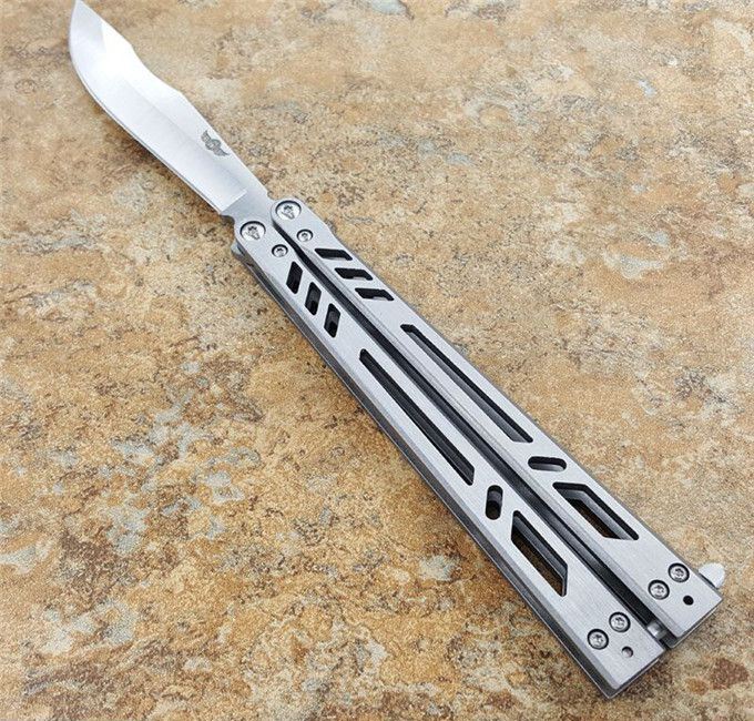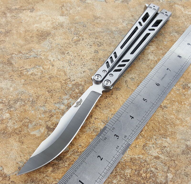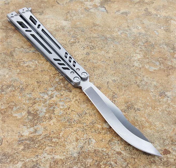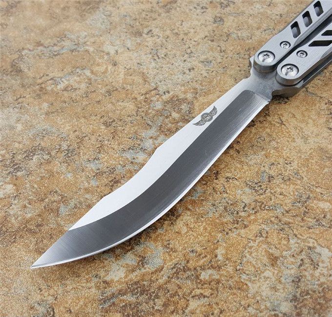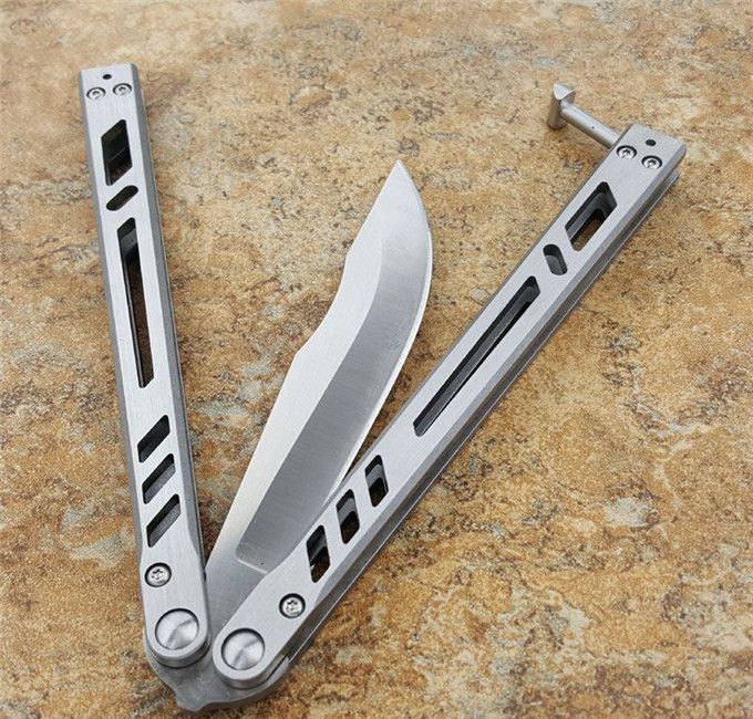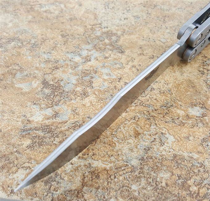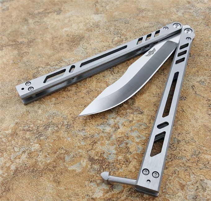 theone瘦子蝴蝶甩刀 全长:25.4CM 刃长:11.11CM 刃厚:0.3CM 刃材:440C 柄长:14.3CM 柄厚:1.06CM 刃表面:沙光 重量:147克 theone纯钢打造,全数控精确机加工,雕刻镂空柄,轴套系统转轴,打造一流蝴蝶甩刀