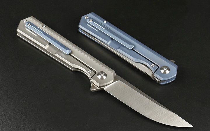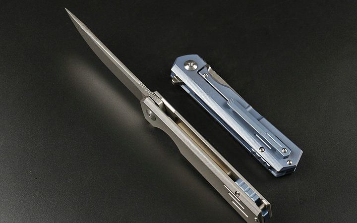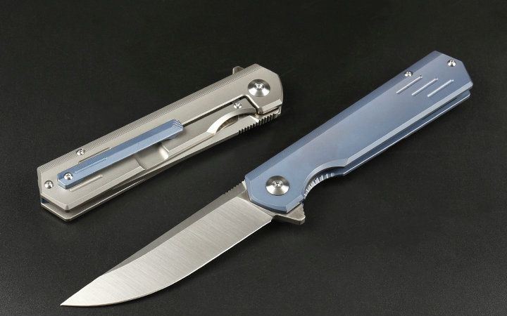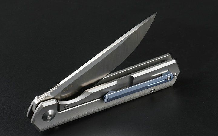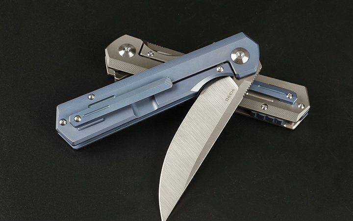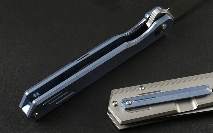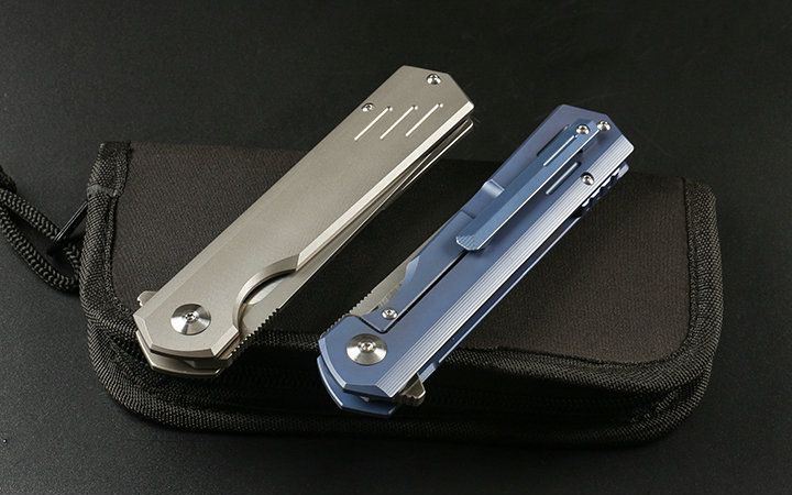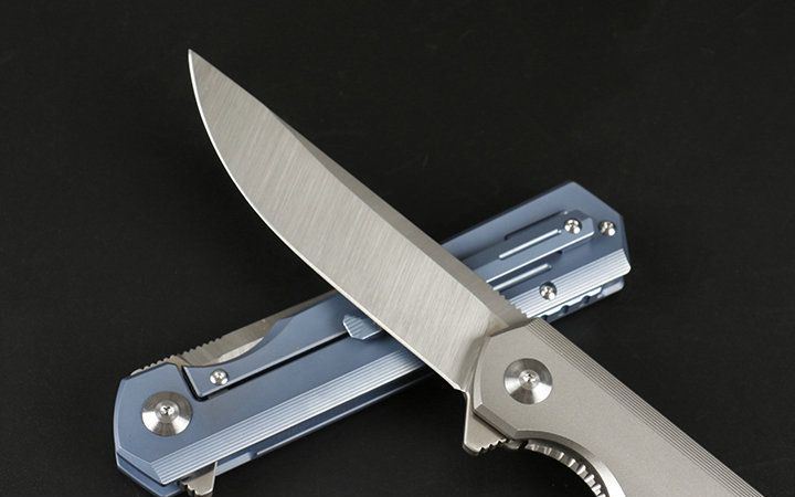 M390和钛折刀 全长:21.5cm 刃长:9.2cm 柄长:12.3cm 刃宽:2.3cm(最宽处) 刃厚:4.0mm 刃材:优质M390 硬度:60-62HRC 刀柄:钛合金(表面经真空处理) 表面:丝光 锁定:侧锁 重量:170克(含包装) 备注:配优质尼龙套和钛合金背夹。分蓝钛和灰钛两种,下单请注明,谢谢 其他:现货是加装陶瓷轴承,开合更顺畅,由于生产难道大,数量少,是款最热销产品