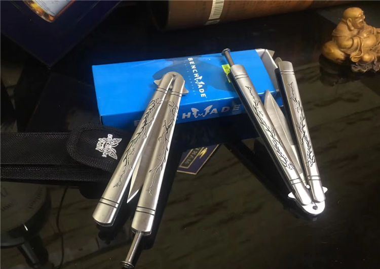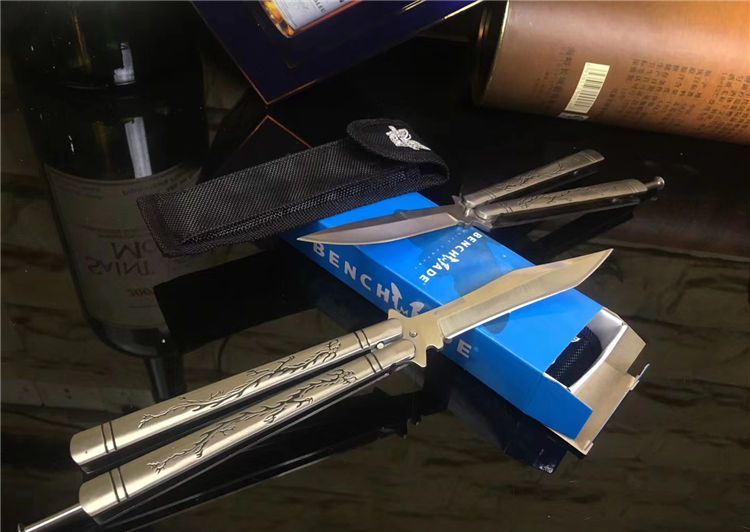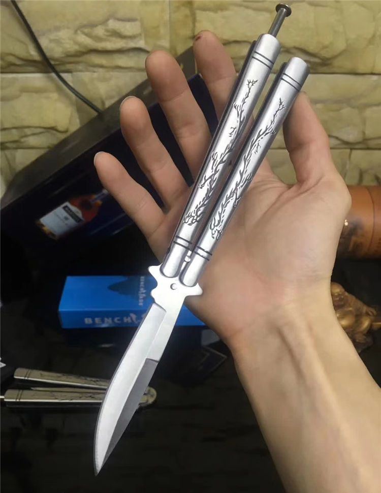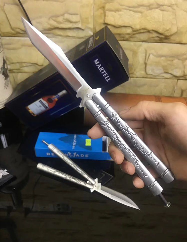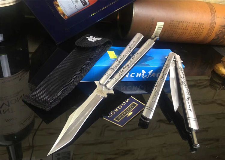 蝴蝶双龙甩刀 尖头、T头 全长:235mm 刃长:90mm 柄长:133mm 刃宽:18mm 刃厚:2.8mm 刃材:3Cr13Mov 重量:160g(含包装) 硬度:55HRC 表面:砂光 柄材:钢柄 锁型:甩刀 其他:配彩盒和尼龙套