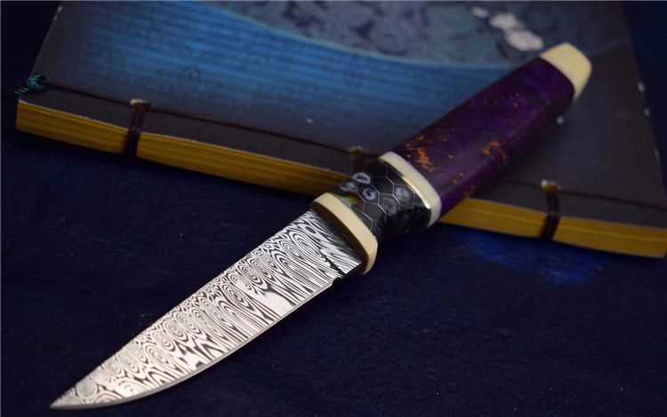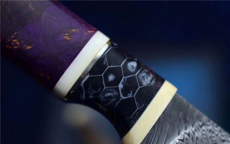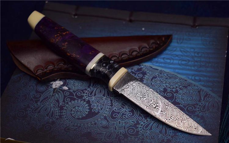 刀刃采用瑞典粉末大马士革钢制作而成,色彩亮丽,护手采用美国复合金属材料,小叶紫檀搭配猛犸牙柄中间隔片藏银 ,抛光精美,手柄采用美国复合金属材料 /染色固化稳定木,握感精细,刀鞘采用头层牛皮制作,彰显高雅,除了极具装饰性之外•瑞粉高强的防锈性能为您增添了更多实用选择,性价比高