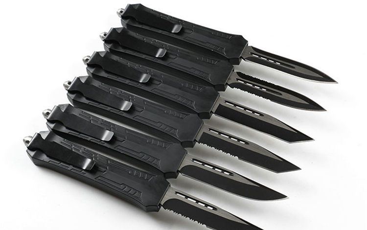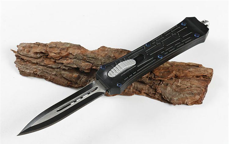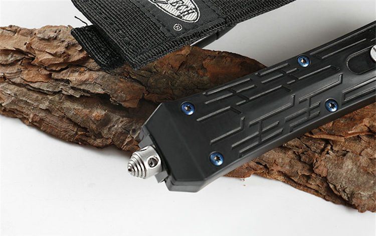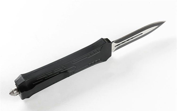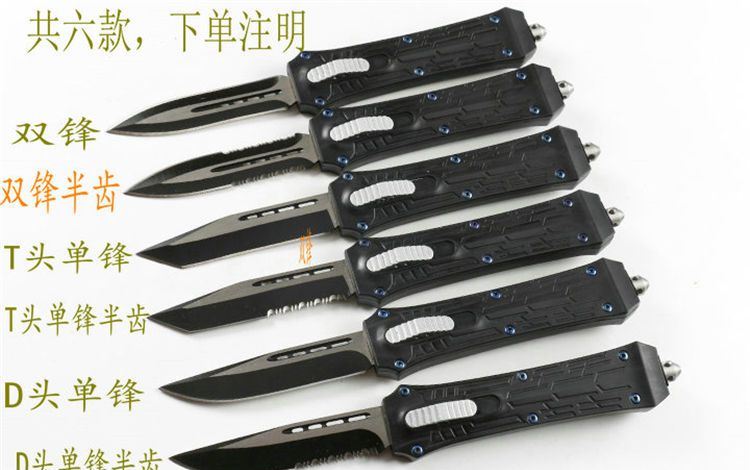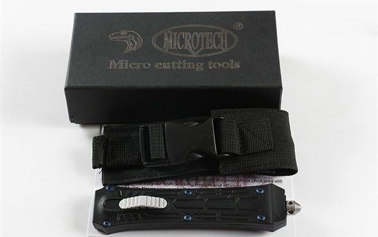 微技术伤齿龙D02直出跳刀 全长:24.2cm 刃长:9.8cm 刃厚:2.9mm 刃材:440 硬度:57HRC 刀净重:232克 总重量:350克(含包装物) 表面:发黑 柄材:锌铝合金 刀鞘:尼龙套 锁闭:弹簧直出