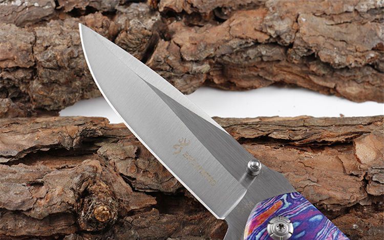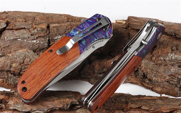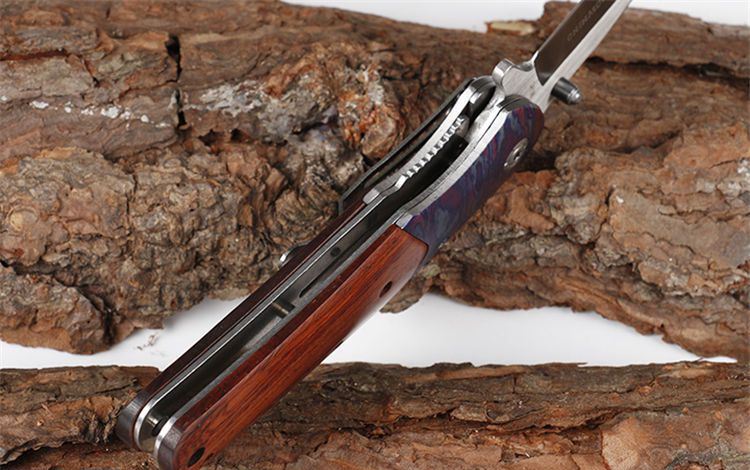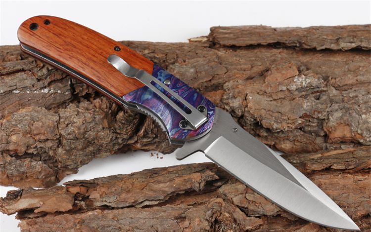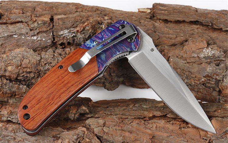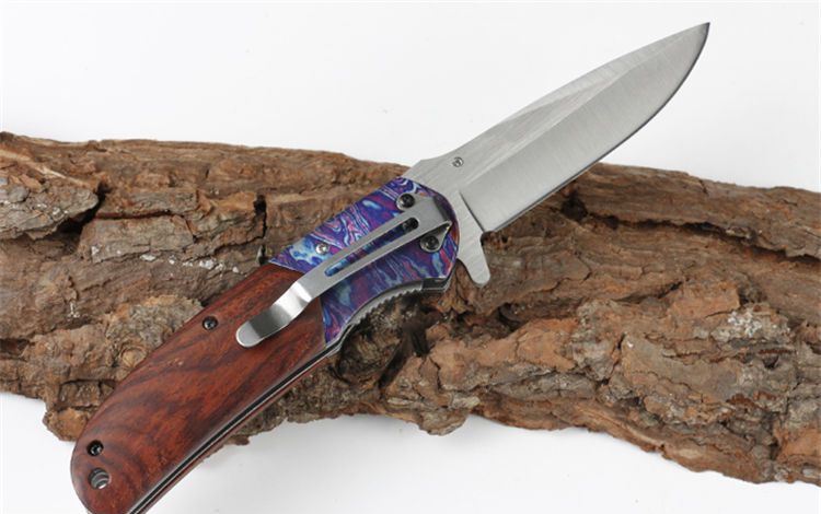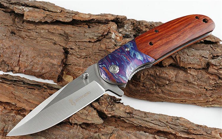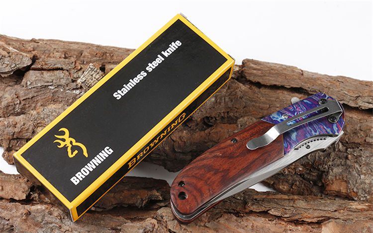勃朗宁DA138战术折刀 全长:22.5cm 刃长:9.8cm 柄长:11.7cm 刃宽:2.6cm 刃厚:2.9mm 刃材:440C 重量:195g(含包装物) 硬度:57HRC 表面:沙光伴拉丝处理 柄材:钢头三D打印图案+天然花枝木 锁型:线锁
