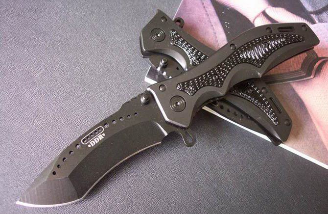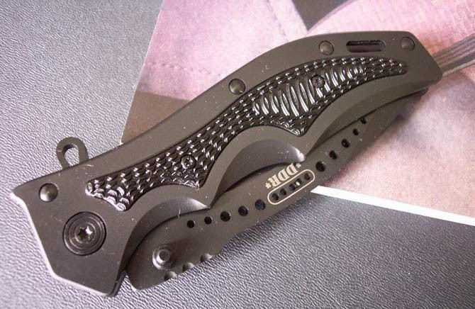ABS刀匠协会DDR闪电快开 全长:22 刃长:9.9 刃宽:2.9 刃厚:0.38 刃材:440 硬度:56-57 刀柄:全钢+黑色铝合金 重量:240克