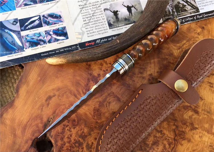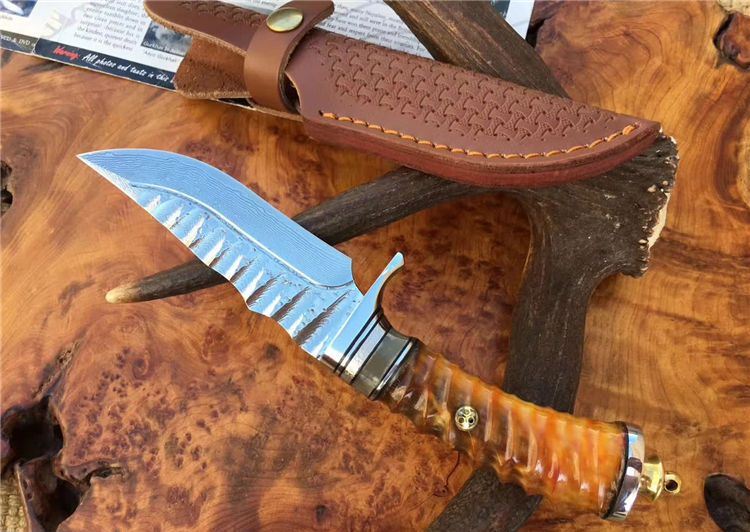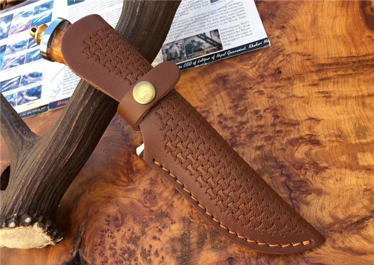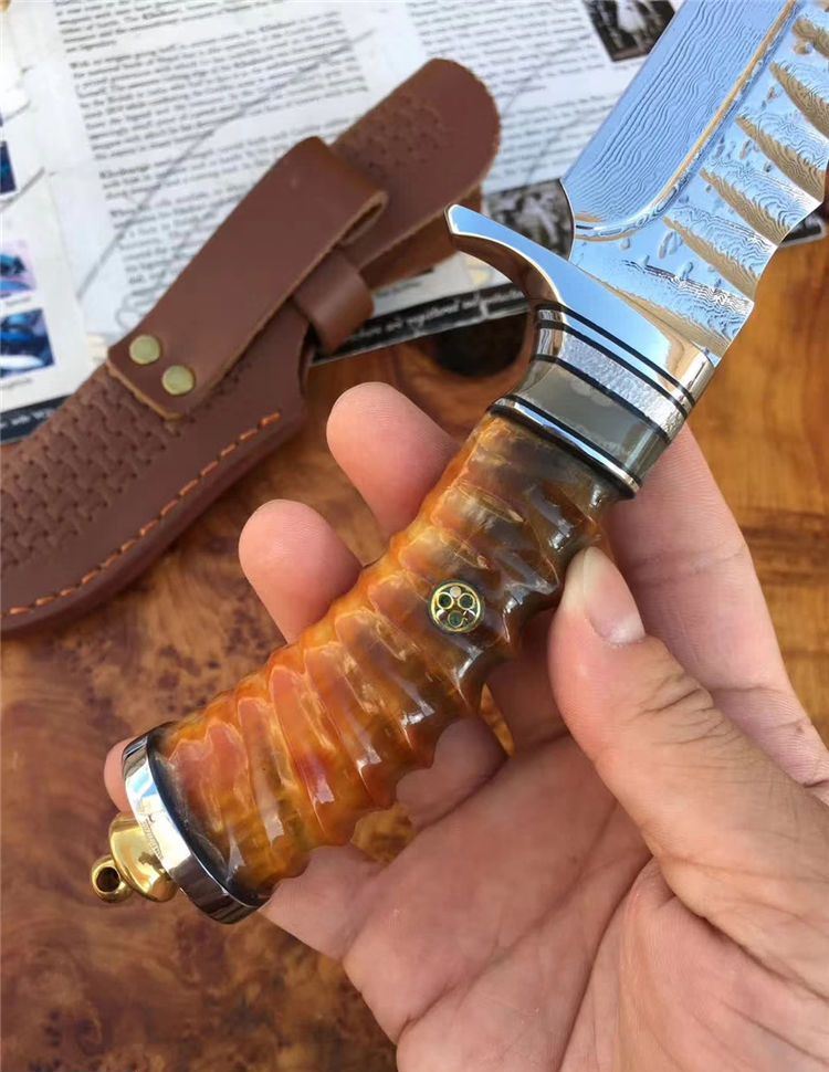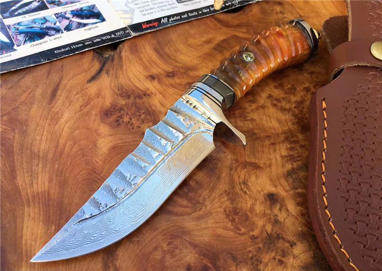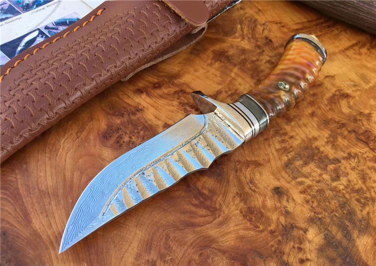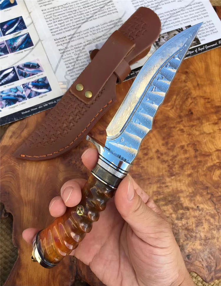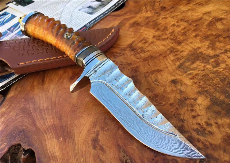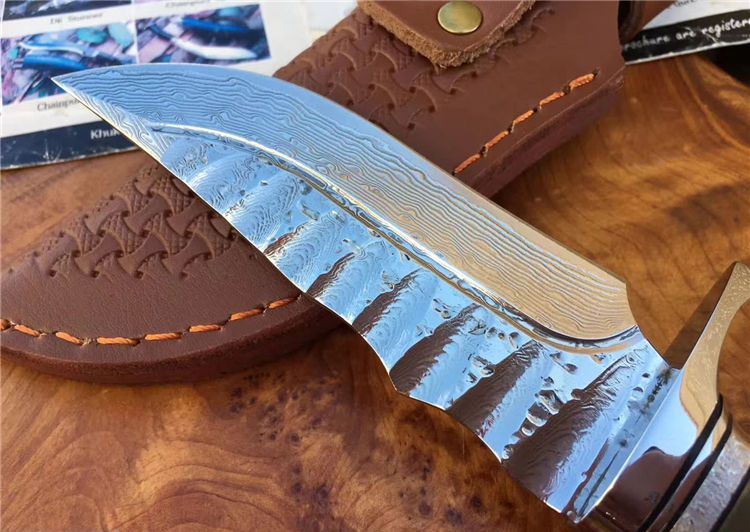 大马士革山峰直刀 全长:27.0cm 刃长:14.5cm 柄长:12.5cm 刃宽:3.4cm(最宽处) 硬度:59HRC 柄材:天然黄羊角 量:净重265克 刃材:VG-10钢材 其他:配礼品盒,真皮套