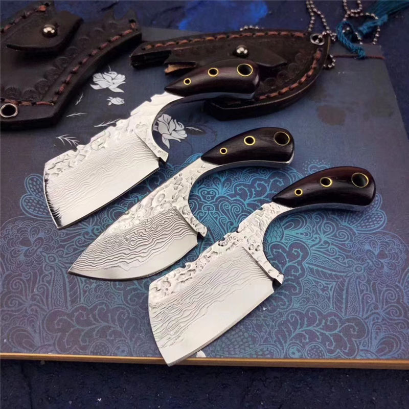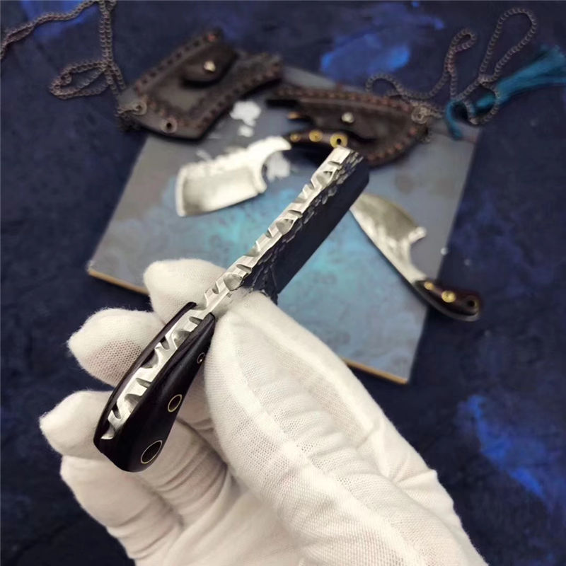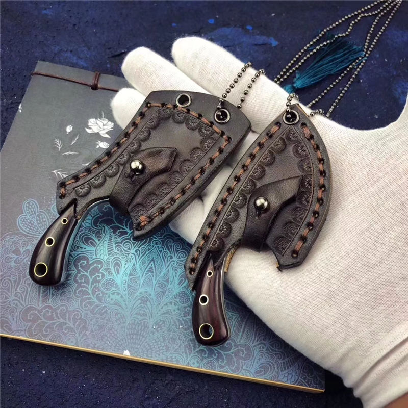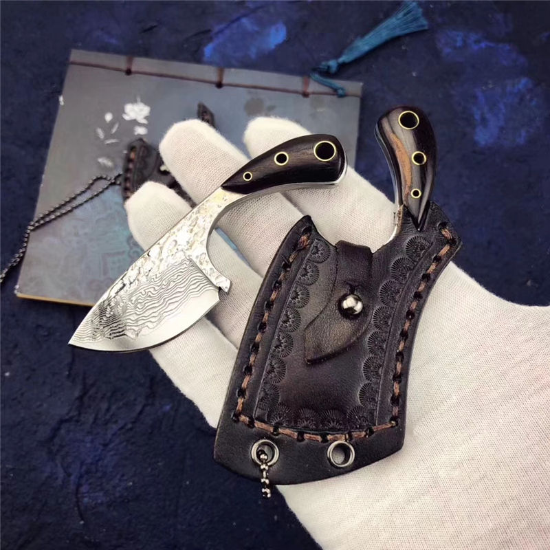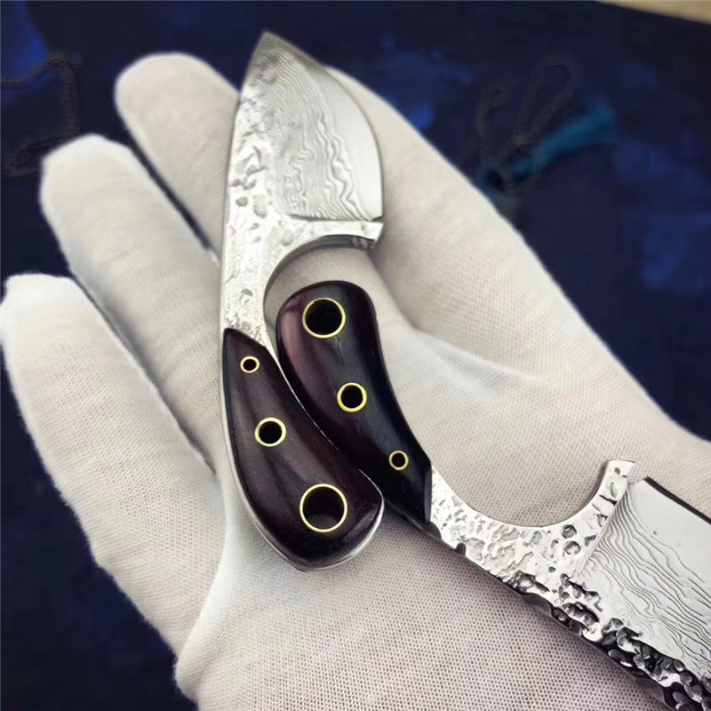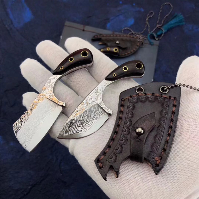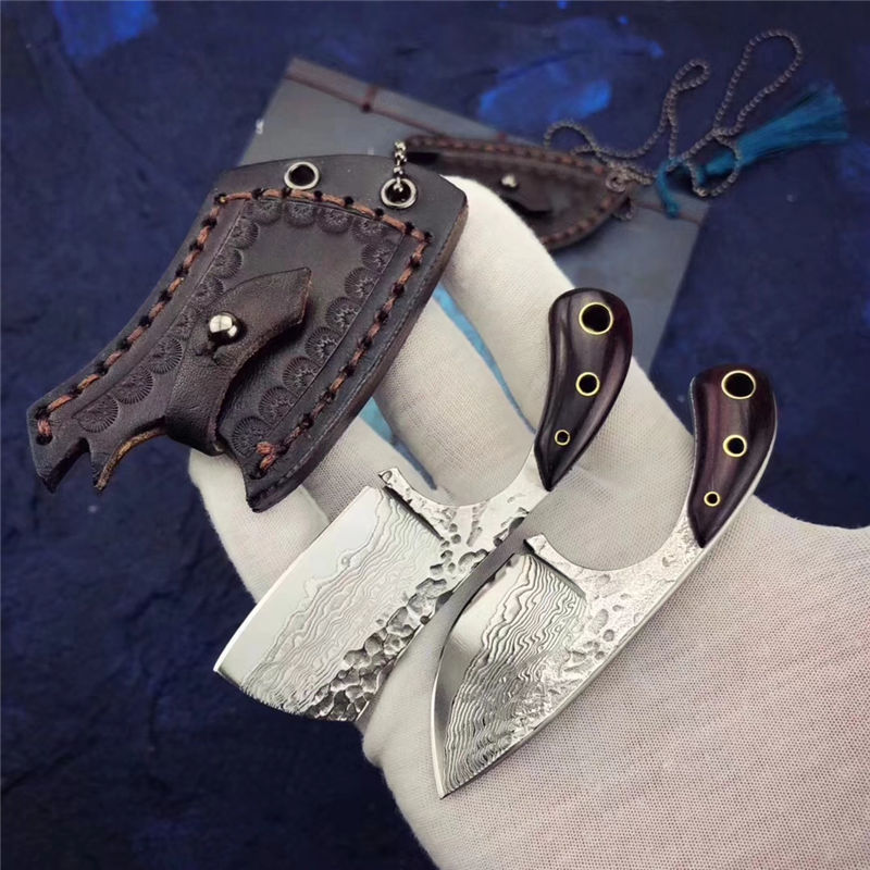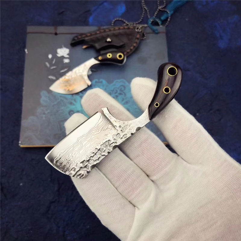 大马士革小财刀香刀 总长:10cm 刃长:4.5cm 柄长:5.5cm 刃厚度:4mm 刃钢材:进口一体大马士革钢 硬度:60HRC 刃宽:2.6cm 手柄材料:紫檀木配套 包装:雕花手工皮套+黑色手工盒子包装 聚财福到一款纯手工制作迷你小香刀,刀身钢材/进口一体大马士革钢90层、表面保留锻打原纹,手柄采用紫檀木镶嵌搭配设计,手工开刃锋利度极高 喜欢玩把收藏的不可错过