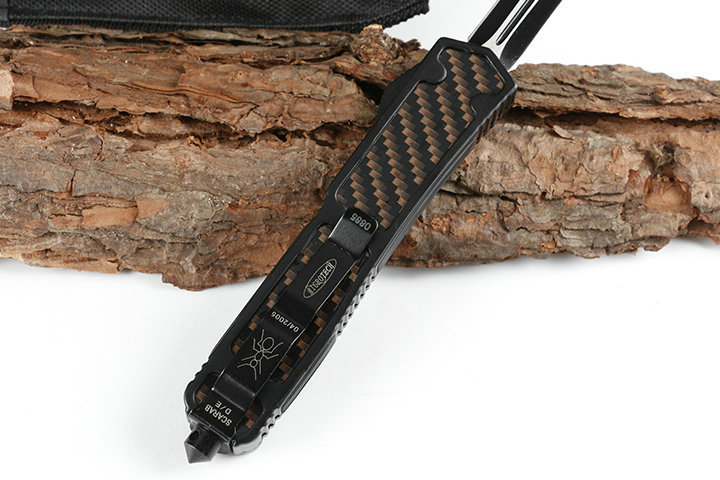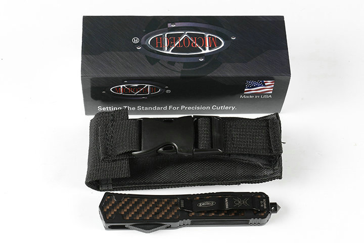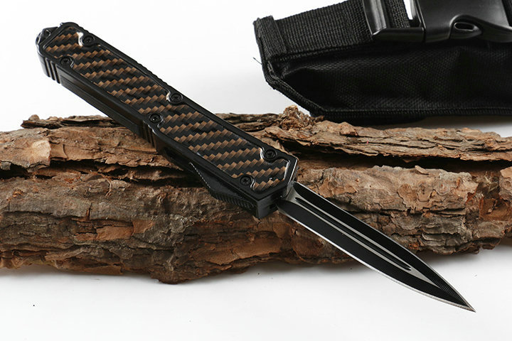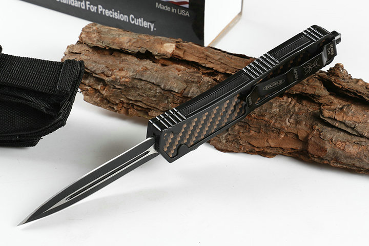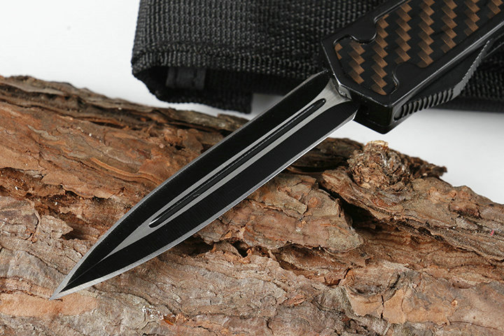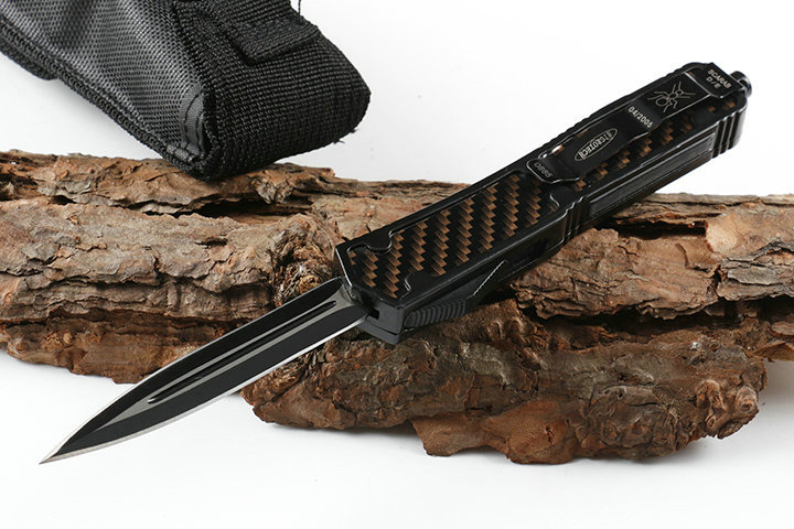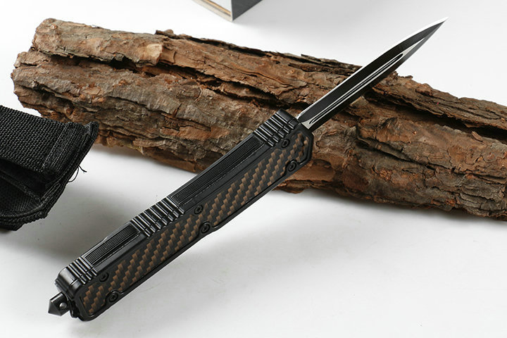 微技术碳纤纹双锋黑蚁跳刀 类型:直出弹簧刀 品牌:MICROTECH微技术(仿品) 开启长度:21.5CM 合起长度:13.1CM 刃长:8.5cm 刃厚:0.9CM 硬度:57HRC 刃材:440 表面:刀刃发黑 把手:锌铝合金+碳纤纹胶皮 净重:165克(整刀) 毛重:250克(含包装物) 开合:双动作,直推开关,自动弹出和收回 包装:耐磨专用战术尼龙套。 口袋刀夹:弹簧刀夹 玻璃敲击器:钨质玻璃敲击器