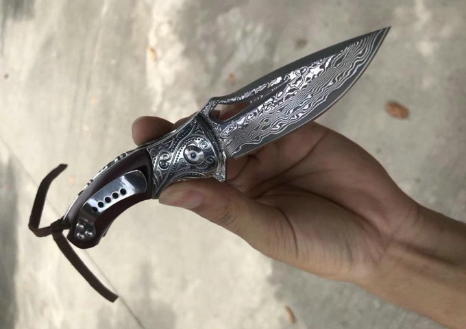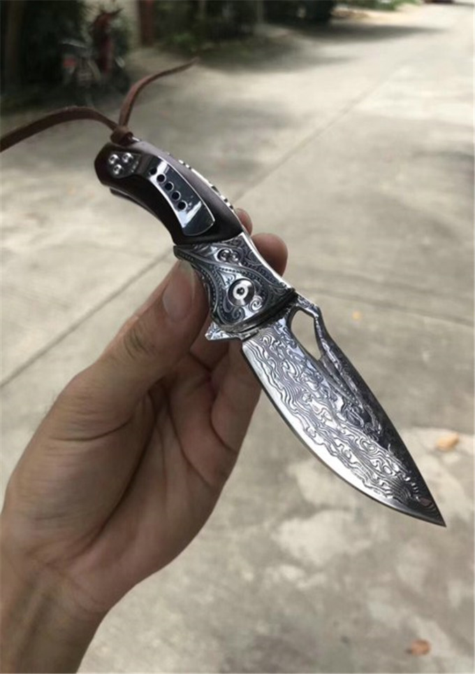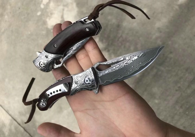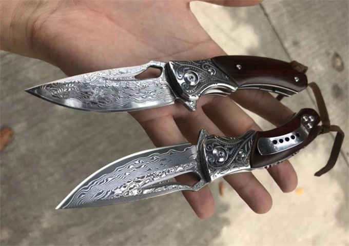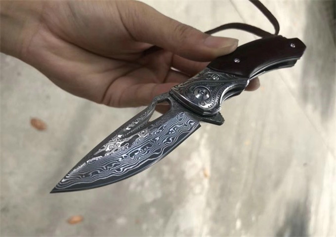 大马士革鹭鸶快开折刀 总长:165MM 刃长:70MM 刃宽:26MM 刃厚:3.3MM 钢材:日本夹层大马士革钢,真空深冷热处理 轴承:进口陶瓷滚珠轴承 柄材:沙漠铁木,配皮绳子 盒子:硬盒子礼盒包装