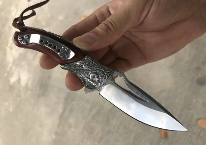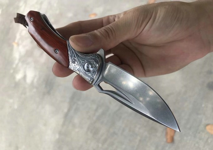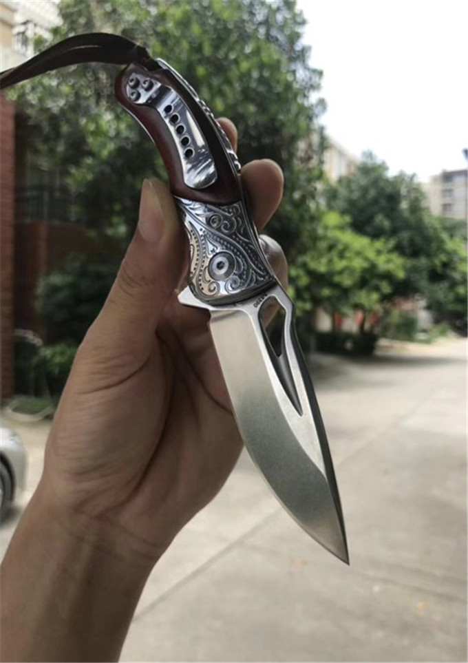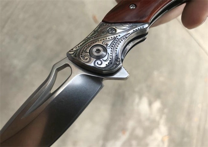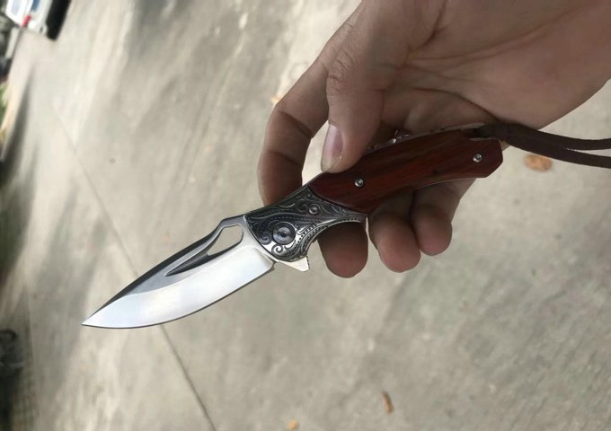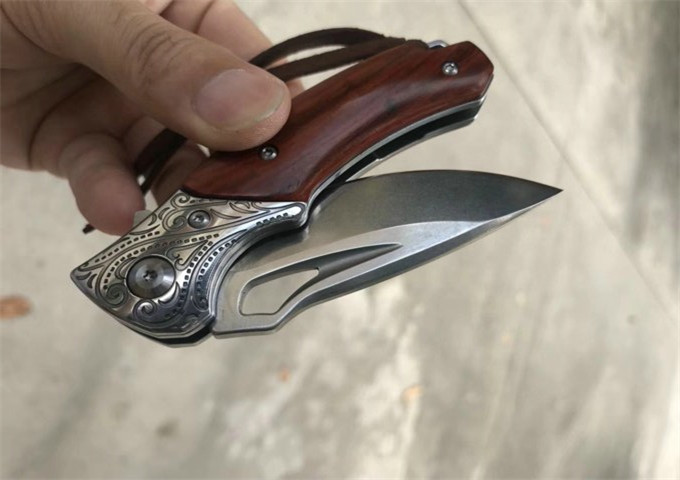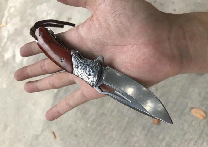 鹭鸶折刀 总长:165MM 刃长:70MM 刃宽:26MM 刃厚:3.3MM 钢材:M390粉末钢,真空深冷热处理 硬度:60-61HRC 轴承:进口陶瓷滚珠轴承 柄材:微粒黄檀木,配皮绳子 盒子:硬盒子礼盒包装