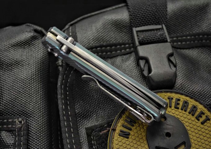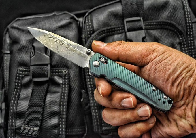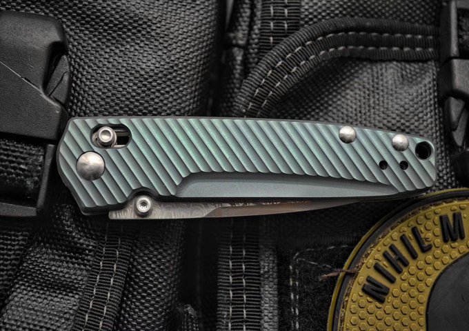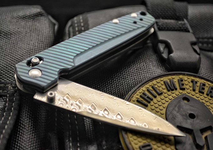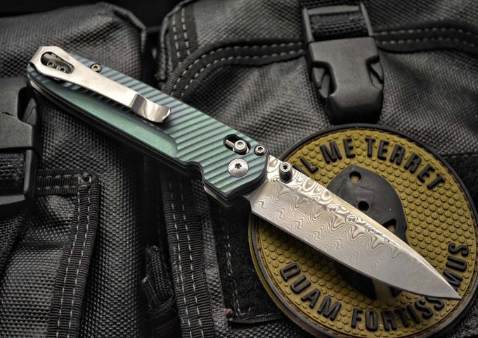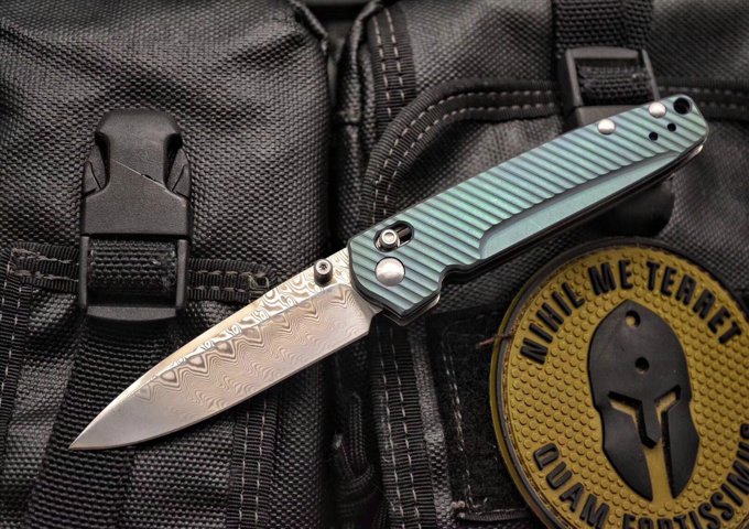 巨力版Benchmade蝴蝶折刀 全长:17cm 刃长:7.5cm 刃厚:0.25cm 刃才:无夹层大马士革钢,硬度59HRC) 刀型:水滴头 刃型:平磨 柄长:9.5cm 柄材:钛(表面阳极氧化) 颜色:蓝/金/绿 重量:86g