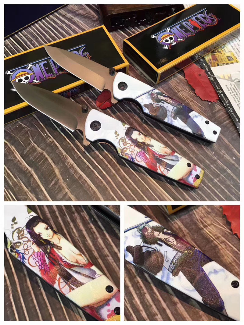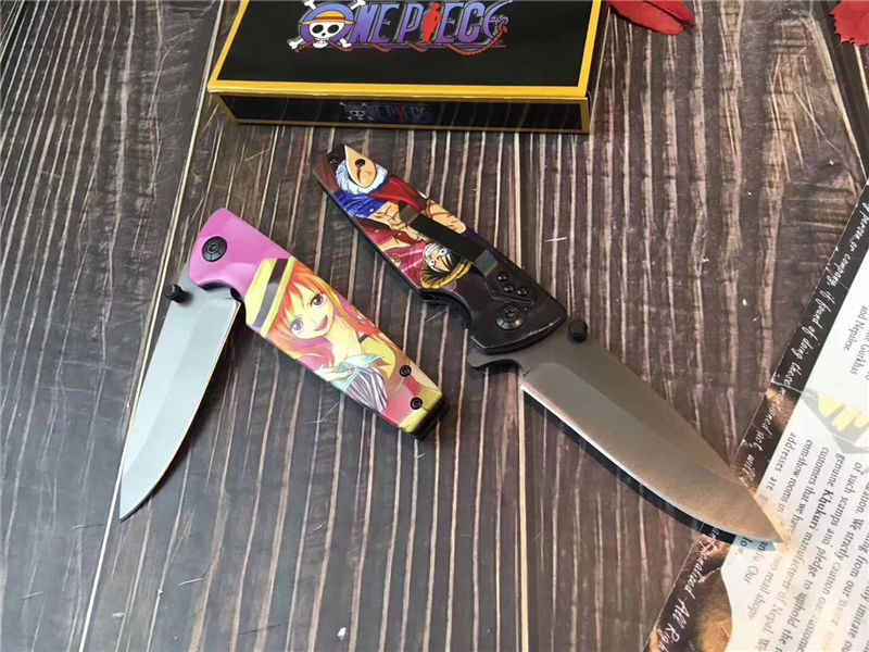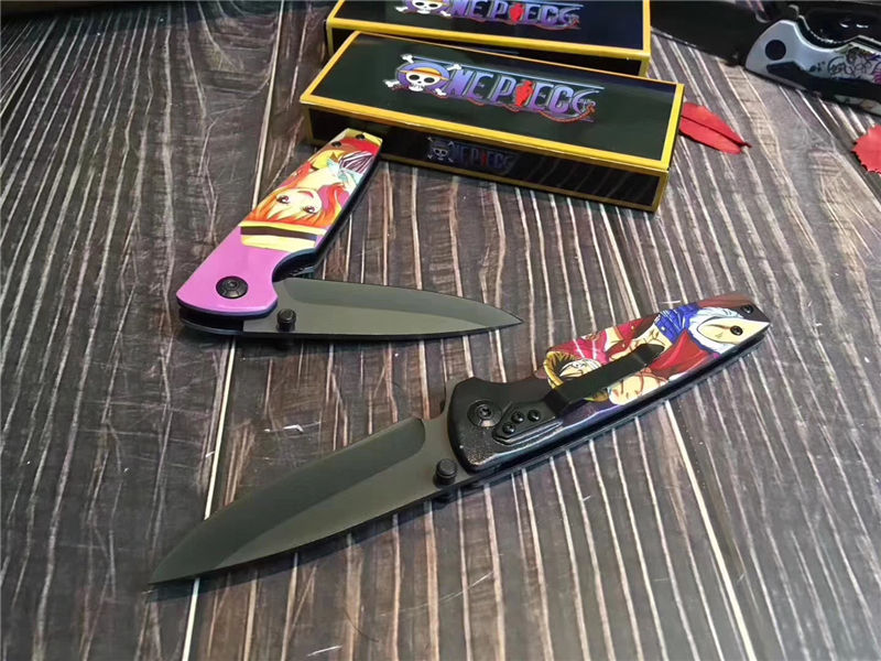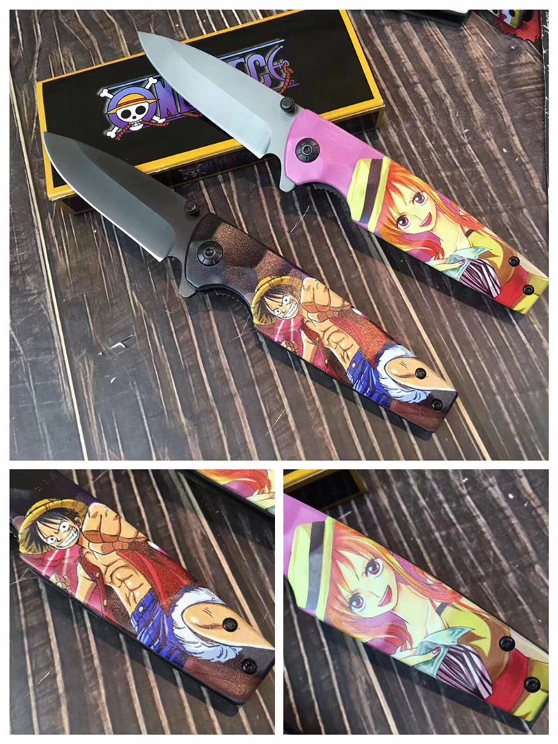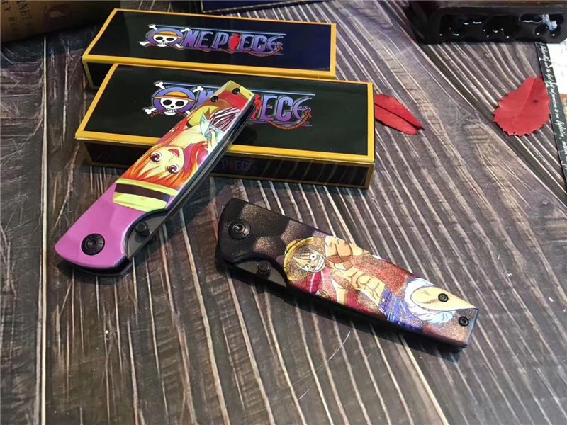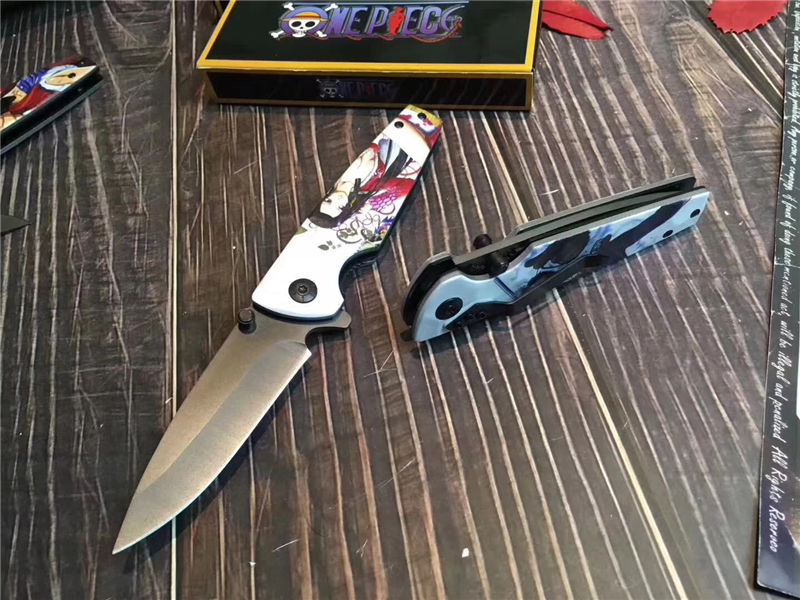 海贼王快开折刀 全长:19.8mm 刃长:84mm 柄长:116mm 刃宽:31mm 刃厚:3.5mm 刃材:5CR 13MOV 重量:195g (含包装物) 硬度:58HRC 表面:灰钛 柄材:全钢 锁型:线锁 其他:彩盒