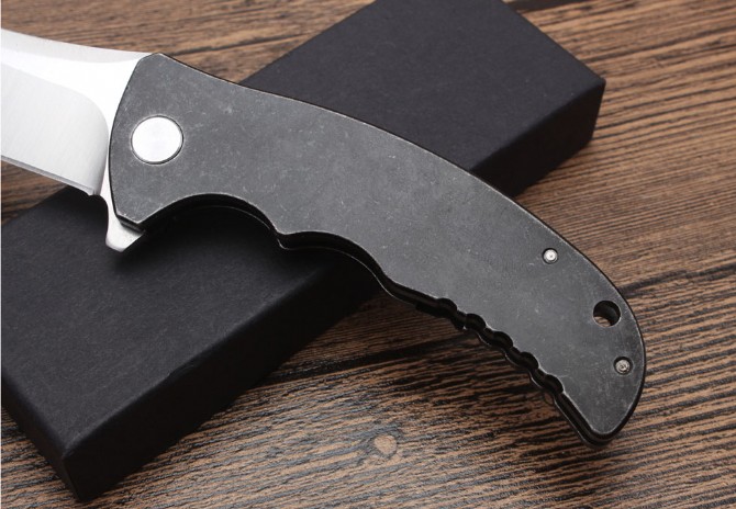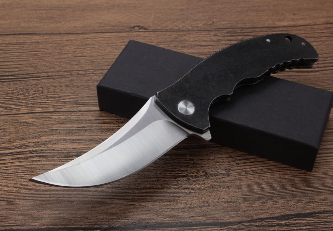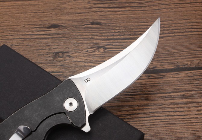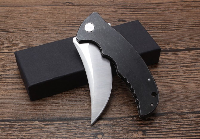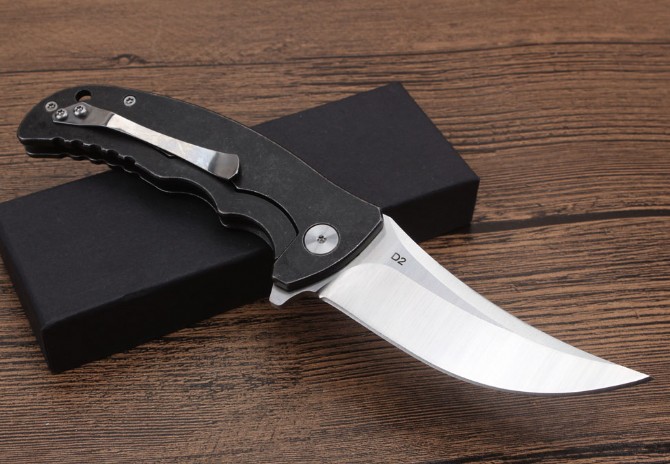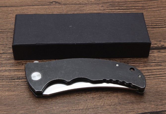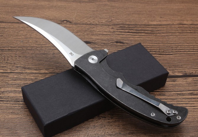 月牙快开折刀 全长:20.2cm 刃长:9.1cm 柄长:11.6cm 刃厚:0.33cm 刃宽:3.0cm 刃材:D2钢 柄材:全钢 硬度:58HRC 净重:330克(含包装) 锁定:线锁配礼品盒