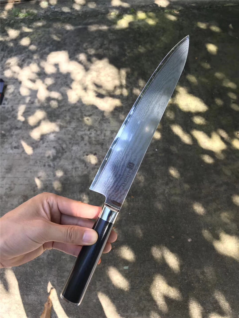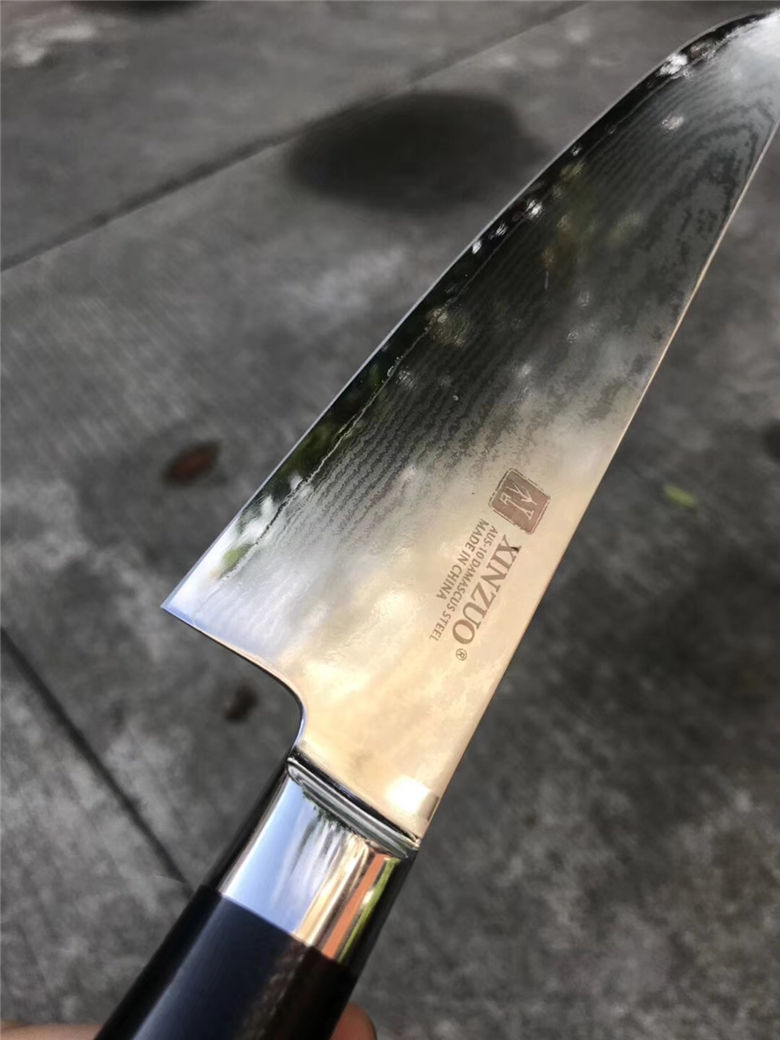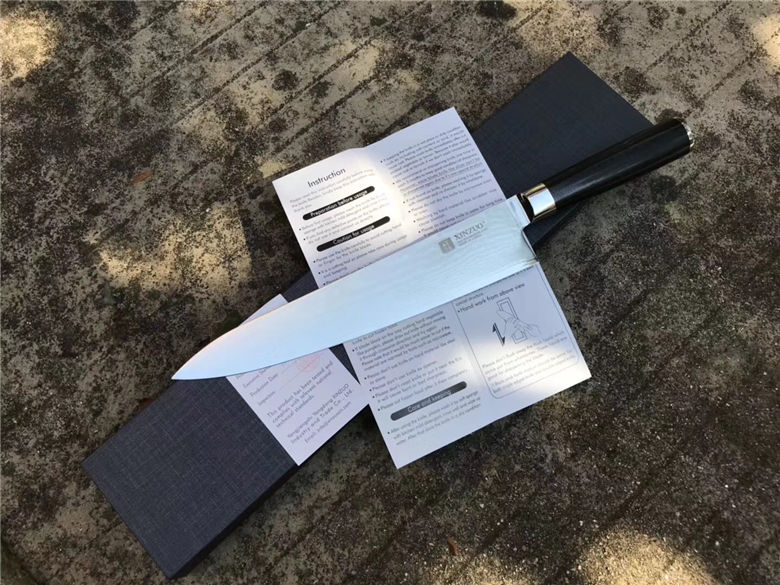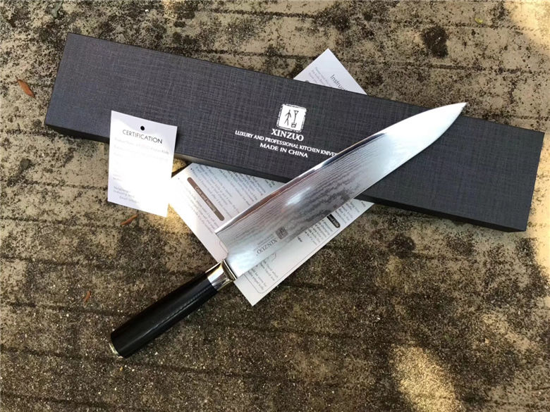 正品XINZUO高端大马士革厨刀9.5寸牛刀 总长:37cm 刃长:24cm 刃宽:4.5cm 刃厚:2mm 柄材:进口米克塔 包装:高端手工礼盒,配英文合格证说明书 一款送礼绝对有面子高端厨刀!好货不要错过!