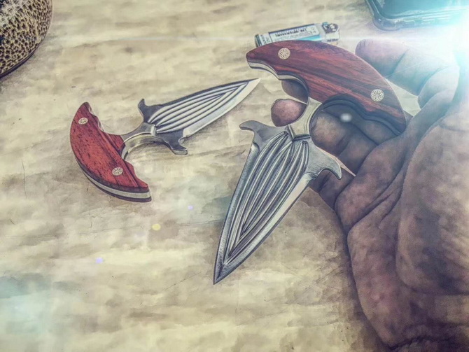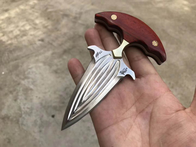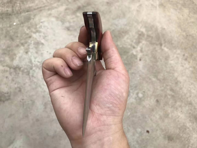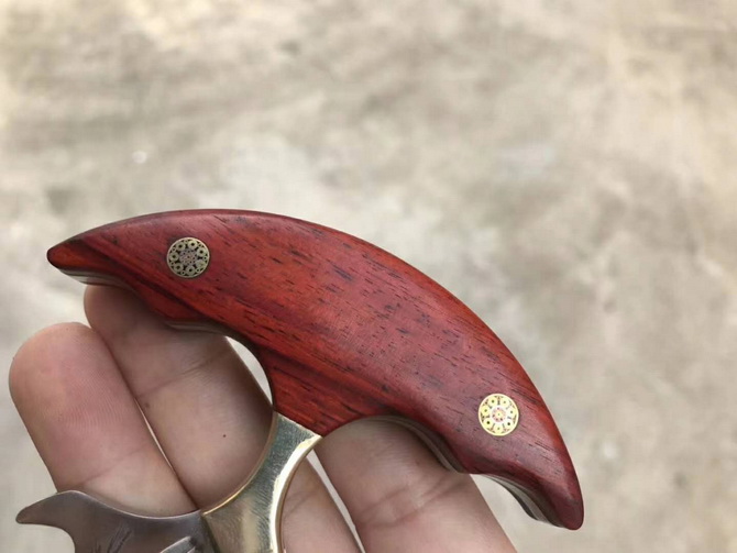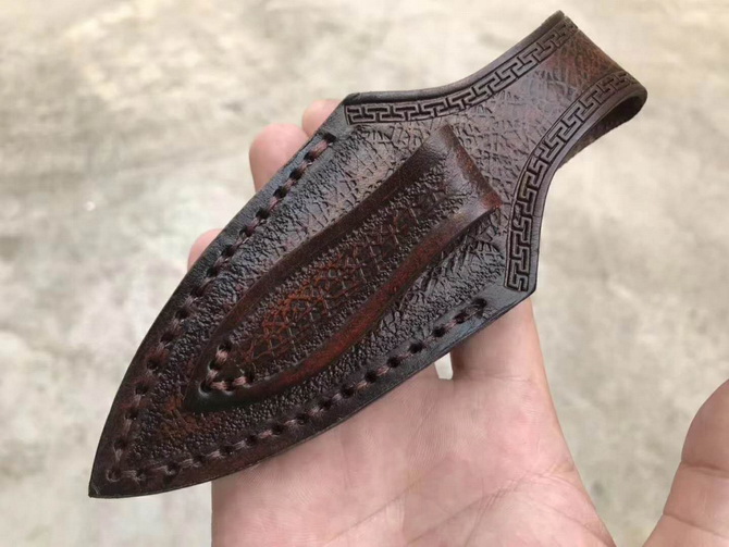 托德贝格血魔手刺 全长:13.5CM 刃长:7CM 刃宽:3.7CM 刃厚:0.46CM 钢材:D2钢 净重:约153g 硬度:59-60HRC(真空热处理) 柄材:黄铜+进口科檀木 表面:精幼砂光 皮套:意大利进口植鞣手工雕花皮套(纯收工制作雕花缝线) 包装:黑色礼品包装盒 配件:马赛克铆钉