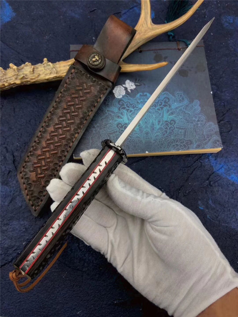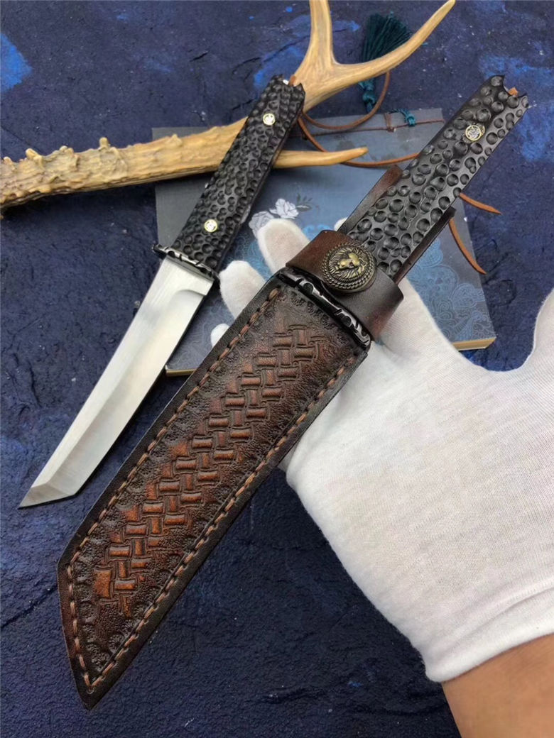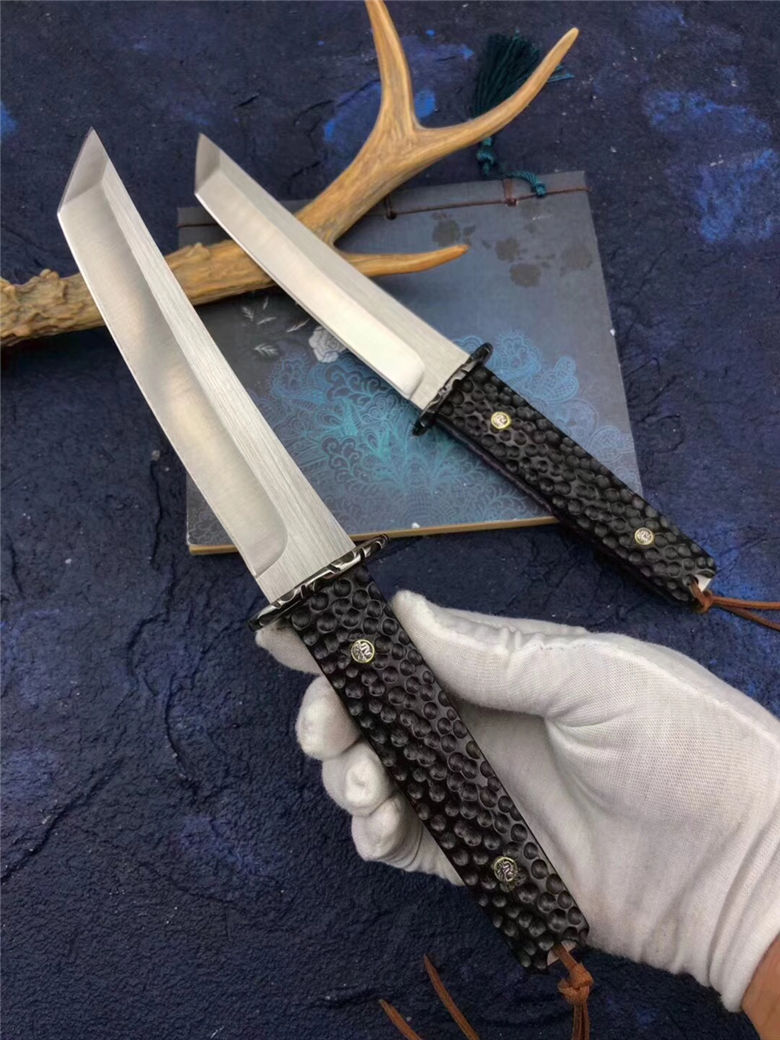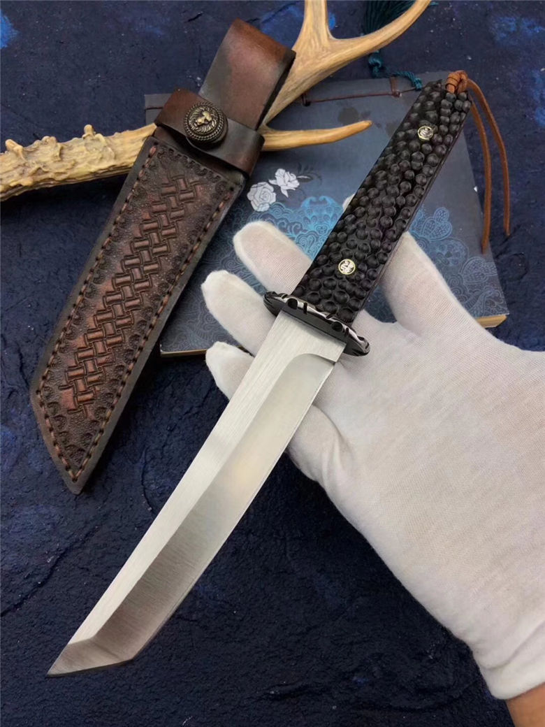 纯手工版烈风忍者刀、ATS钢材料-韧性保持度好极其锋利,手工打磨蜂窝式黑檀木防滑手柄,【豹】字防伪铜钉镶嵌其中,手工雕刻石洗效果护手!尾部手工刻花龙骨,