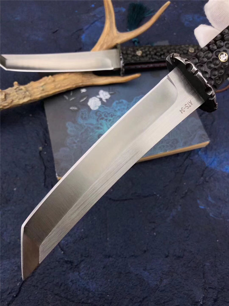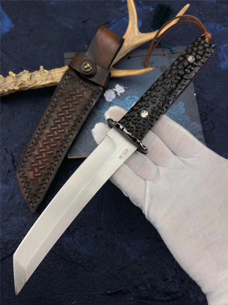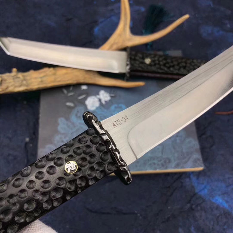 ATS神烈风武士直刀 总长:270MM 刃长:150MM 刃厚:4.5MM 刃宽:最宽处27MM 刃材:ATS-34钢刃 硬度:60-61HRC 皮套:意大利手工缝线皮套!复古怀旧效果 纯手工版烈风忍者刀、ATS钢材料-韧性保持度好极其锋利,手工打磨蜂窝式黑檀木防滑手柄,【豹】字防伪铜钉镶嵌其中,手工雕刻石洗效果护手!尾部手工刻花龙骨, 热处理:真空热处理深冷油淬火韧性更加好! 开刃方式:水冷手工开刃!非常值得入手一款武士刀!