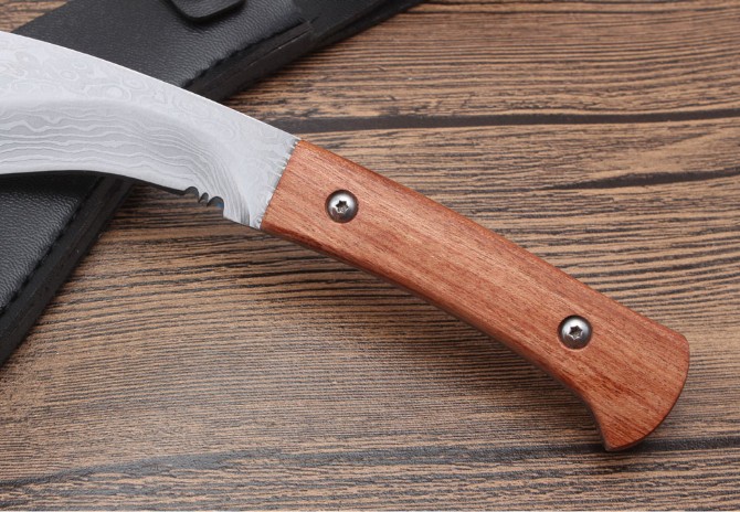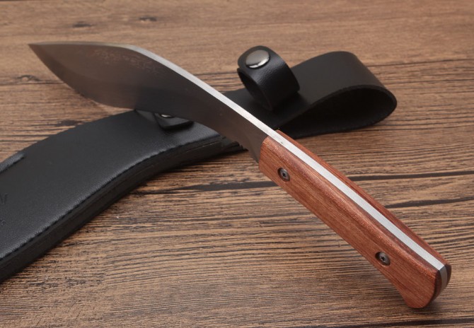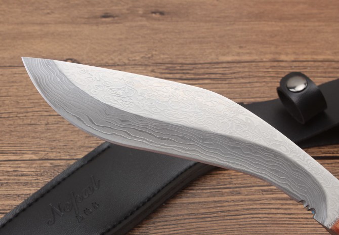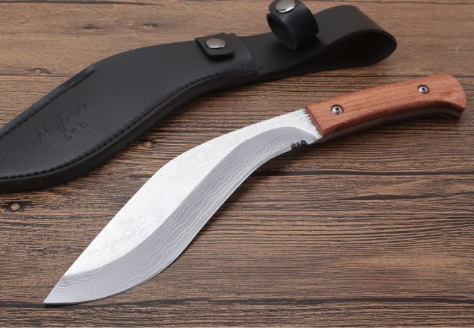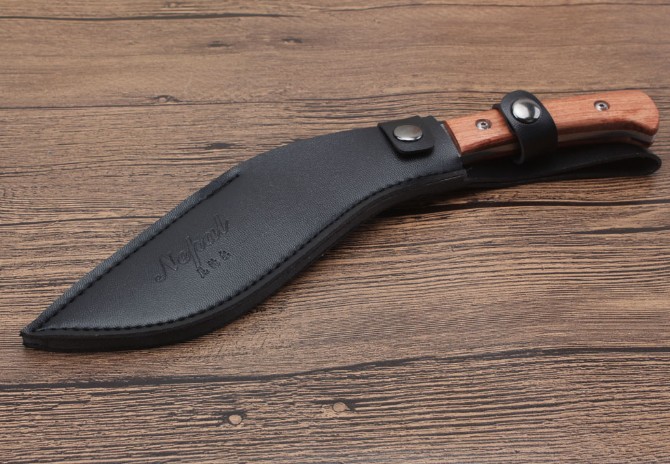 尼泊尔花纹小狗腿刀 全长:26.3cm 刃长:17.5cm 柄长:9.5cm 刃厚:0.4cm 刃宽:3.8cm 刃材:5CR13MOV 柄材:酸枝木 硬度:57HRC 净重:217克(含包装) 表面:花纹 其他:仿皮套
