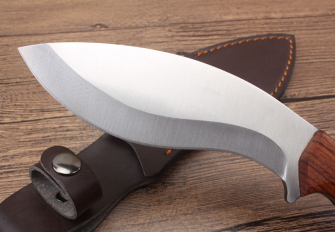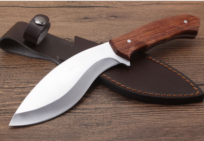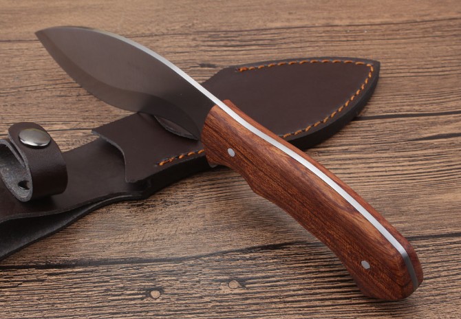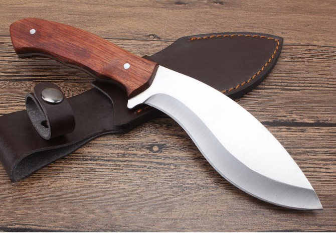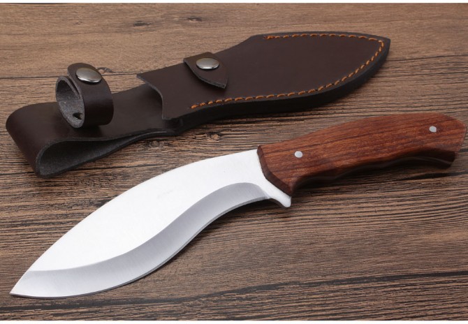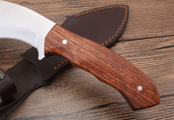 狐狼狗腿刀 全长:273cm 刃长:14.8cm 柄长:12.6cm 刃厚:0.38cm 刃宽:4.8cm 刃材:5CR13MOV 柄材:酸枝木 硬度:58HRC 净重:317克(含包装) 锁定:直锁 表面:沙光 其他:复含皮套