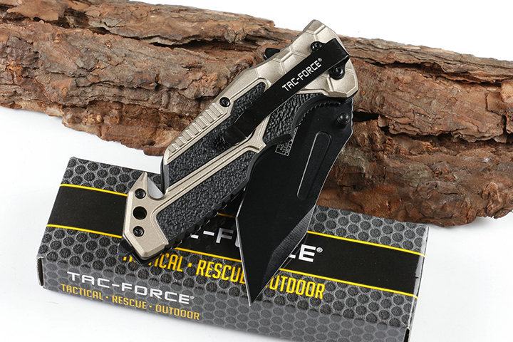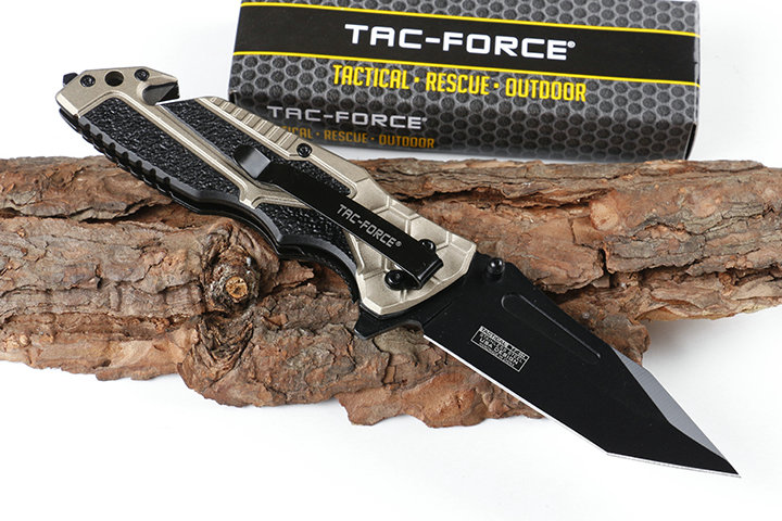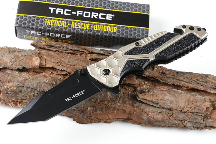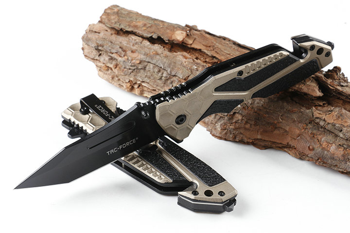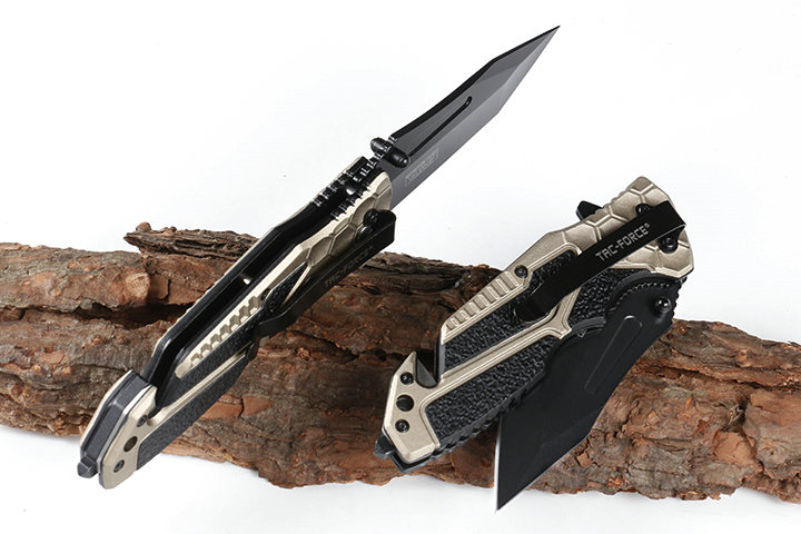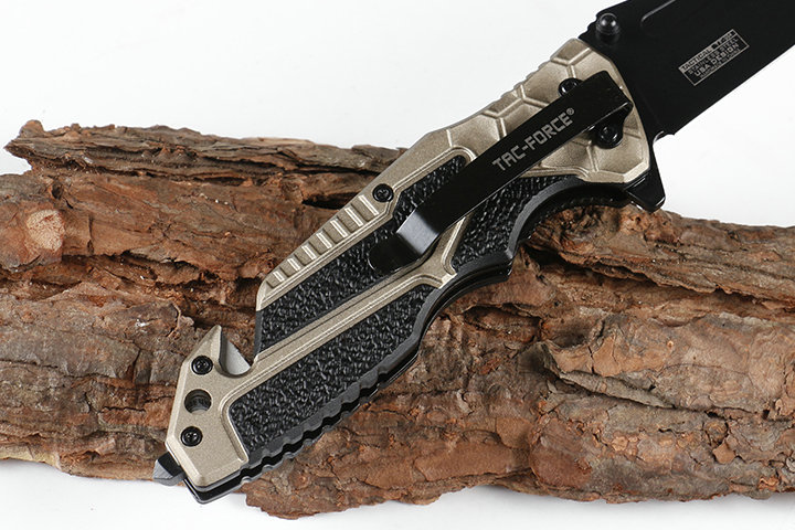 TAC足球折刀 全长:21.2cm 刃长:8.8cm 柄长:12.4cm 刃宽:3.2cm 刃厚:2.8mm 刃材:440 重量:170g(含包装物) 硬度:56HRC 表面:黑钛处理 柄材:全构钢片+铝片 锁型:线锁 其他:彩盒,内置割绳器和撞击器