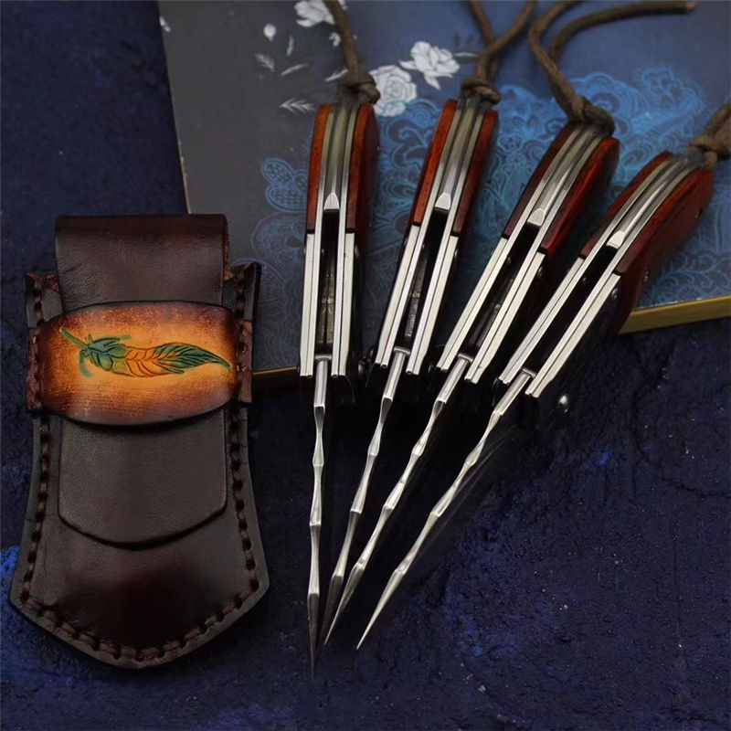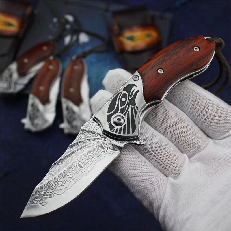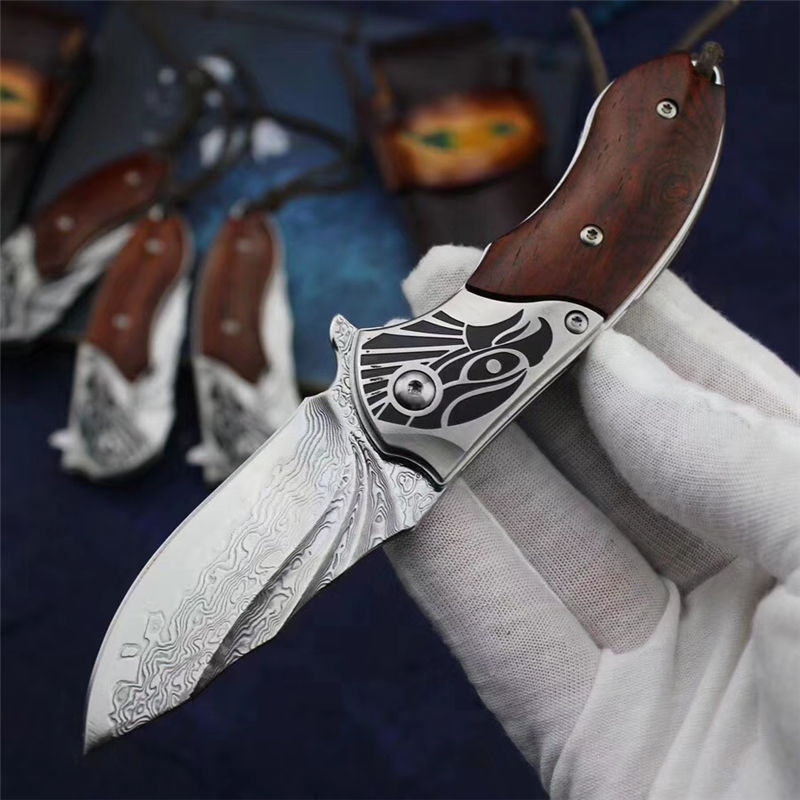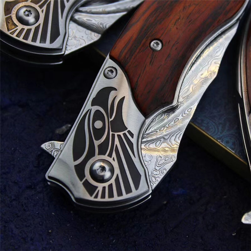 入眼首先看到的是手工擦色的牛皮鞘,鞘的设计-深棕色显色整体很厚重,其次鞘上的羽毛让人联想到鹰的羽毛,无可置疑。 刀入手感觉比较结实,刀枕的雕刻以及表面的拉丝跟微凹黄檀做的铁片来一个直接的对比搭配,显的十分大气。刀枕鹰头的雕刻较为沉稳又不失犀利。刃采用VG10钢芯的大马士革打造,整体的形状以及设计仿造鹰的翅膀,整把刀打开之后,就像看到一个注视猎物、腾飞而起的雄鹰。整体来说,这把刀不管是自用、送礼、收藏都是不可多得的佳品,愿这把刀的主人都像这把雄鹰一样,展翅高飞、大展宏图、鹏程万里