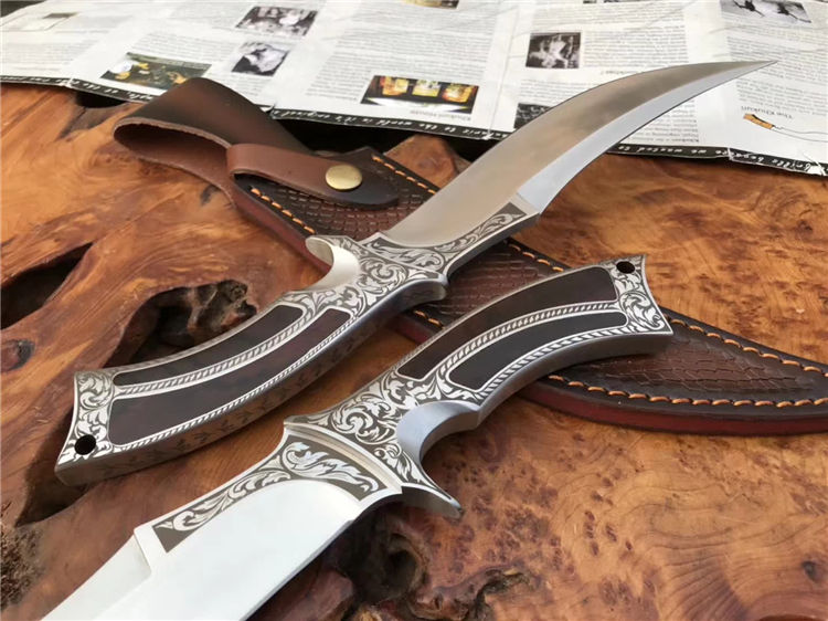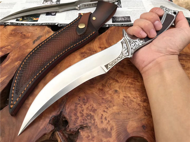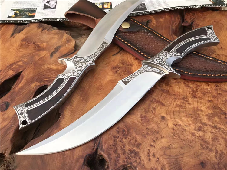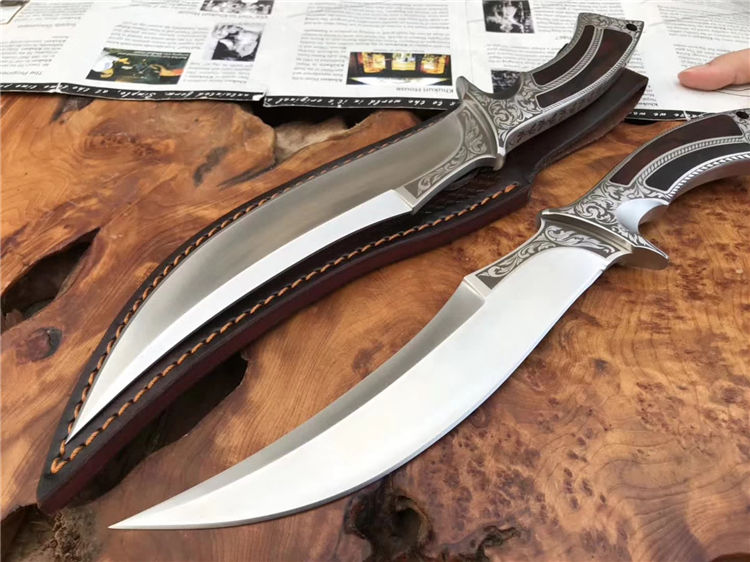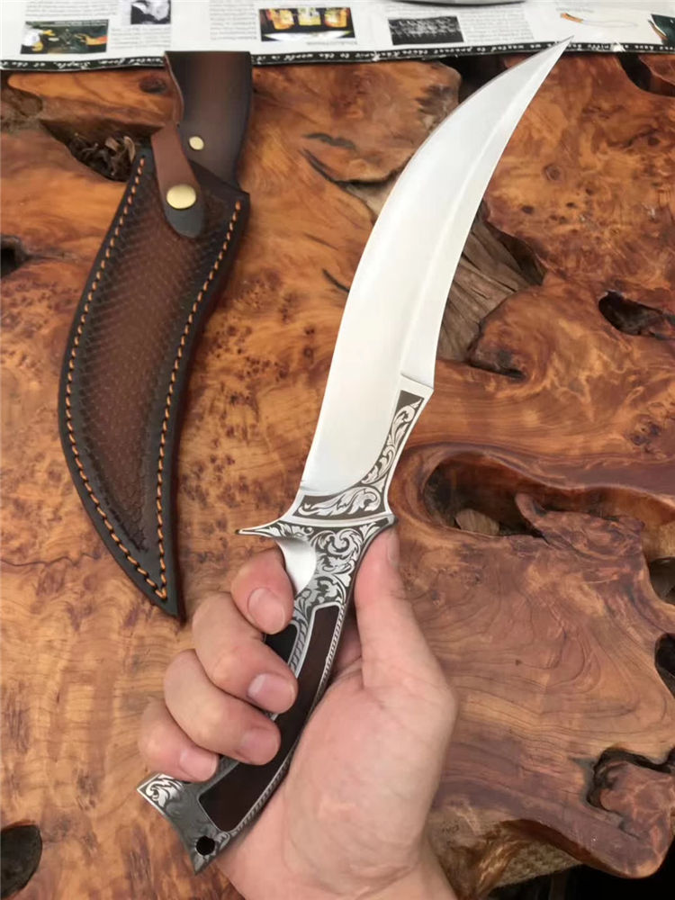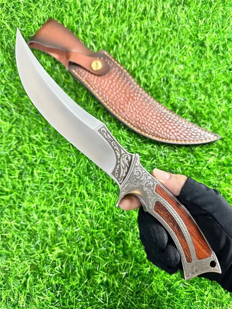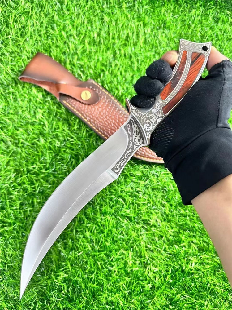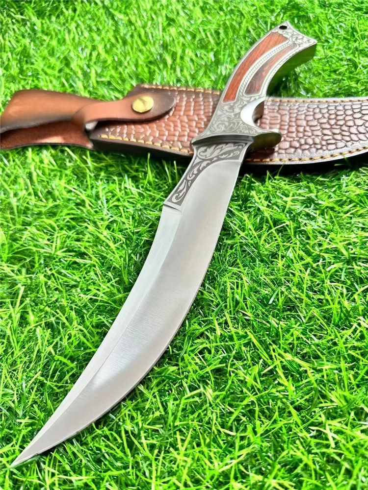 高端沙特阿拉伯军刀 全长:33cm 刃长:21cm 柄长:12cm 刃厚:0.52cm 刃宽:3.9cm 刃材:进口高速D2钢 手柄:微粒黄檀木 手工缝制高端皮套 手工缝制高档皮套手柄镶进口微粒黄檀木,非常锋利