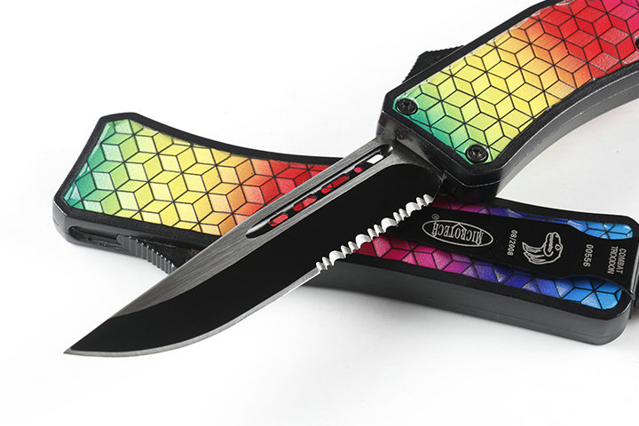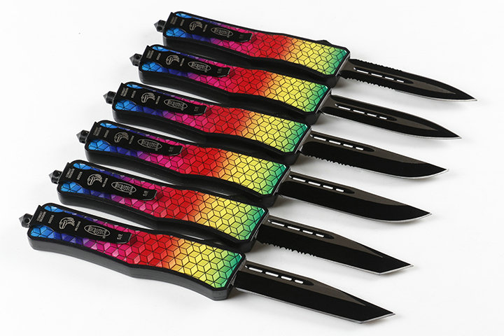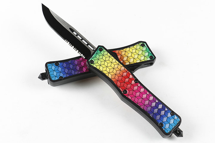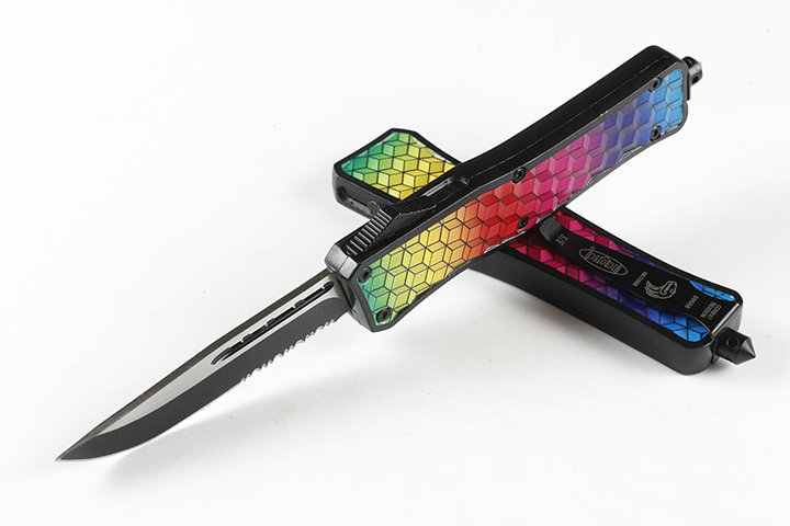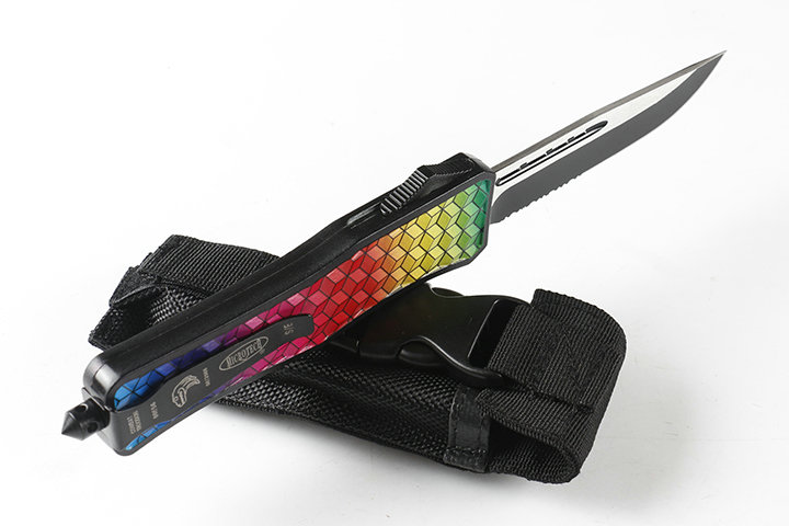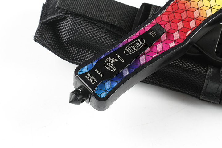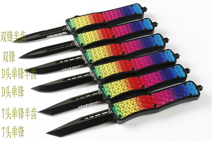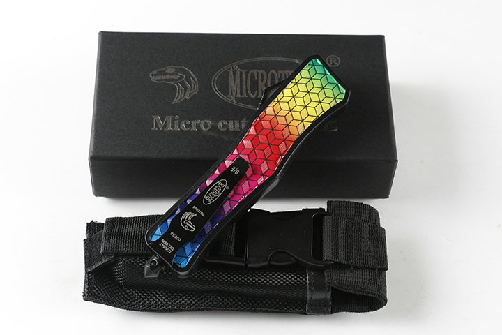 微技术P系列直跳刀6款彩虹色 全长:21.8cm (含尾锥长度) 刃长:8.8cm 刃厚:2.8mm 刃材:440 硬度:57HRC 净重:247.0克 总重量: 462.0克(含包装物) 表面:黑白(刀刃) 柄材:锌铝合金手柄 刀鞘:尼龙 锁闭:弹簧直出 备注:带背夹和玻璃撞针