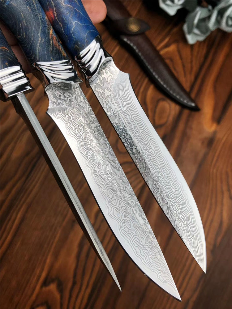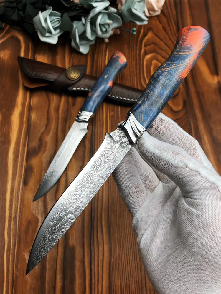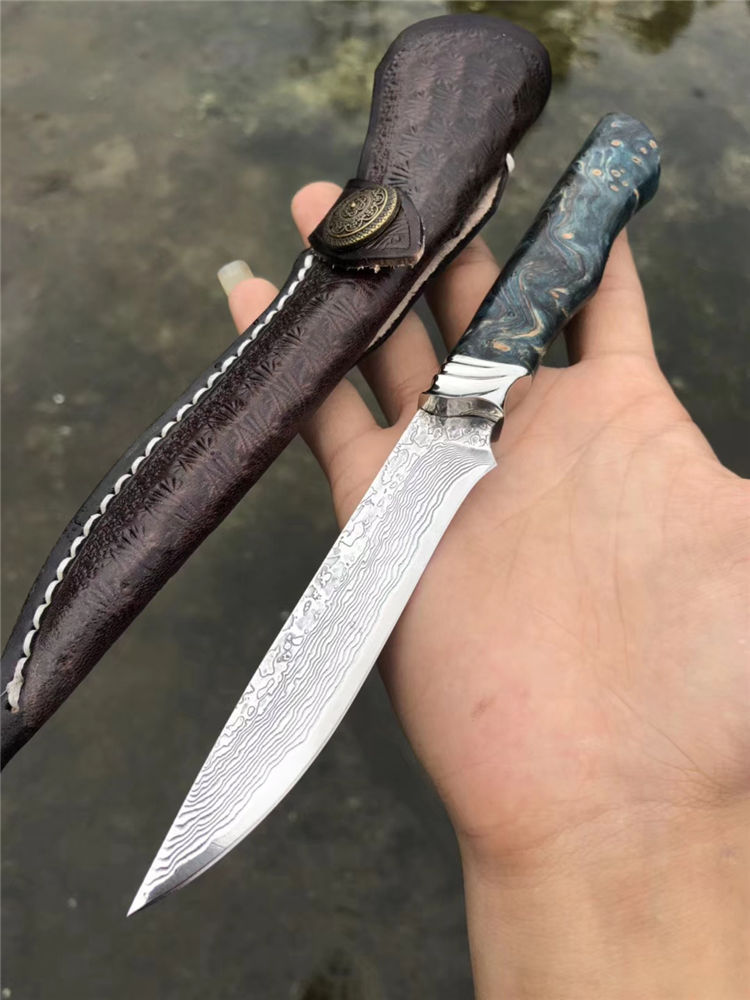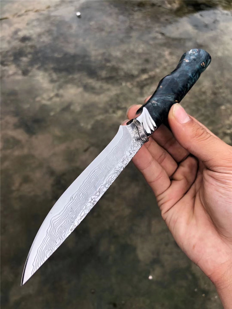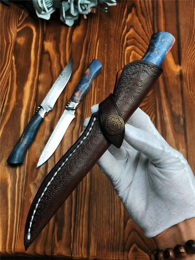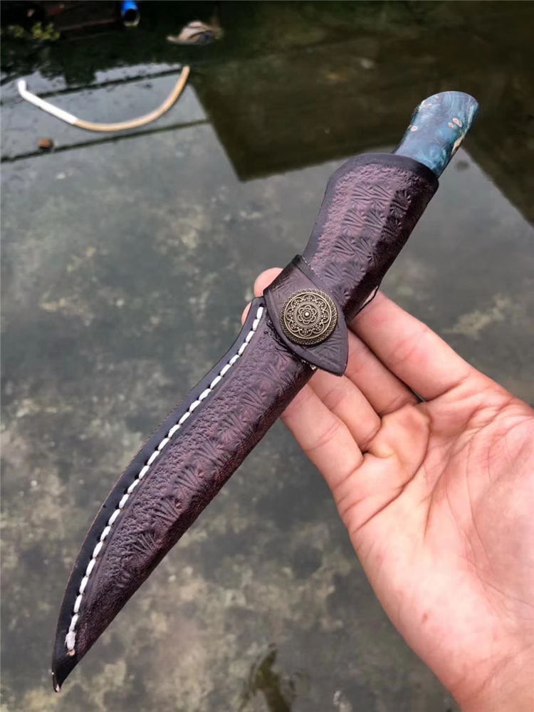 大马士革朱雀直刀 总长:22.5cm 刃长:11.5cm 柄长:11cm 刃材:VG10大马士革钢(95层) 厚度:3.1mm 硬度:60HRC真空热处理 刃宽:2.1cm 柄材:精雕钢头部件+稳定固化木材 皮套:进口手工复古雕花牛皮套包装 配件:高级硬盒+保养刀油 玲珑师作品之一,一款非常强势的猎刀VG10大马士革钢刃材制作,超级耐磨耐腐蚀,钢材韧性与防锈性保持度非常好,手柄/(稳定固化木材)青色火焰,瑰丽绚烂,充满了神秘的浪漫色彩