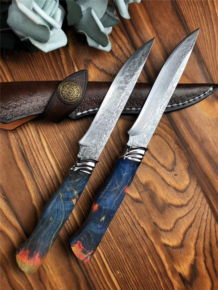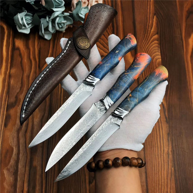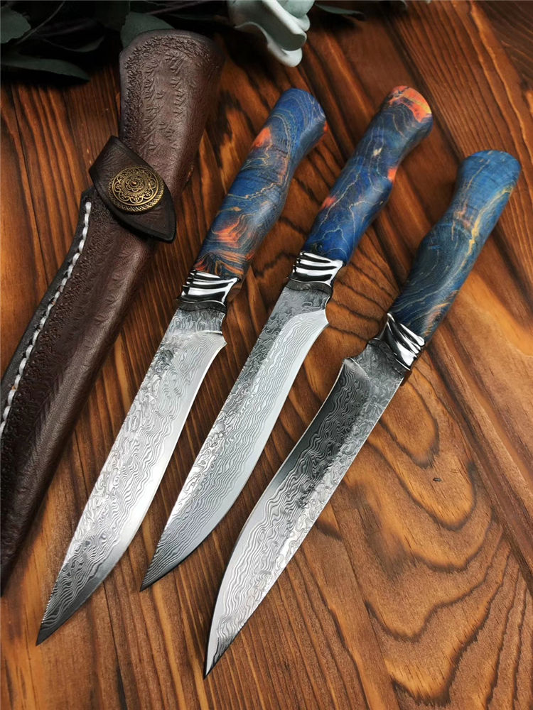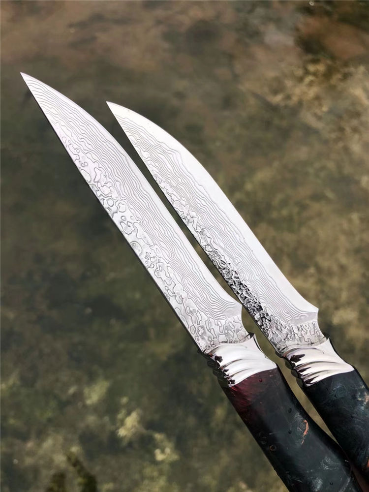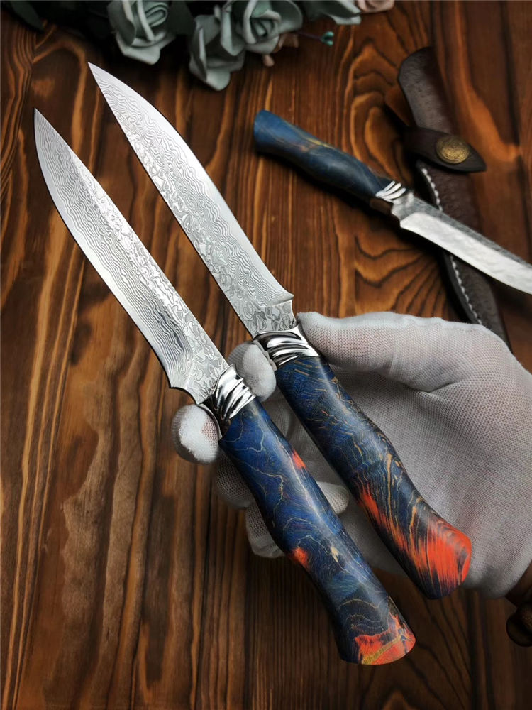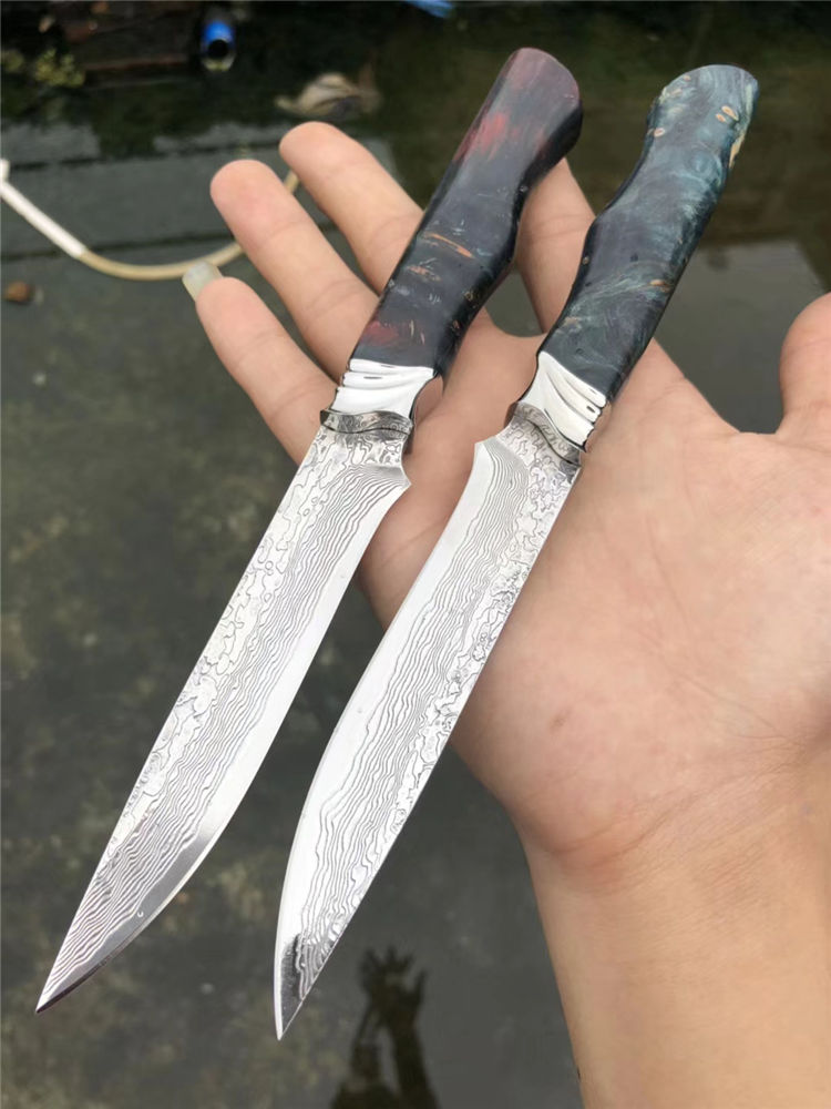 大马士革朱雀直刀 总长:22.5cm 刃长:11.5cm 柄长:11cm 刃材:VG10大马士革钢(95层) 厚度:3.1mm 硬度:60HRC真空热处理 刃宽:2.1cm 柄材:精雕钢头部件+稳定固化木材 皮套:进口手工复古雕花牛皮套包装 配件:高级硬盒+保养刀油 玲珑师作品之一,一款非常强势的猎刀VG10大马士革钢刃材制作,超级耐磨耐腐蚀,钢材韧性与防锈性保持度非常好,手柄/(稳定固化木材)青色火焰,瑰丽绚烂,充满了神秘的浪漫色彩