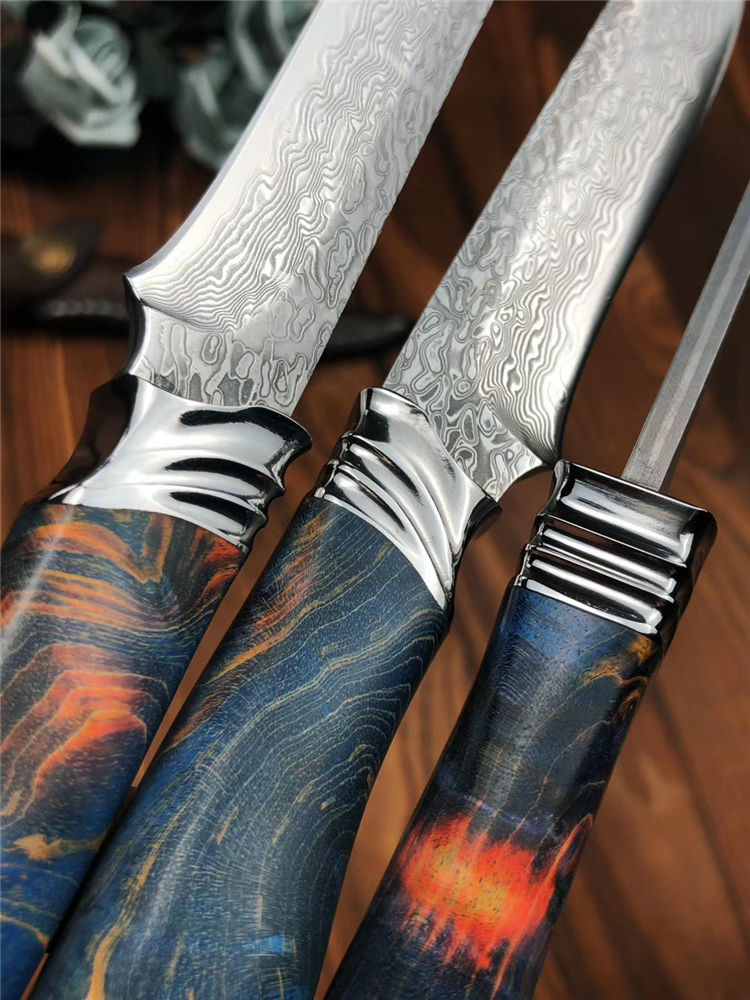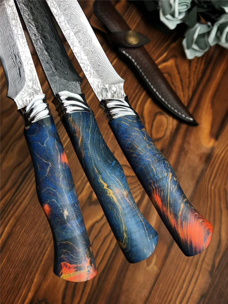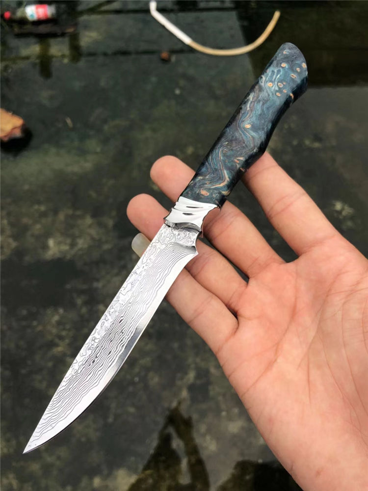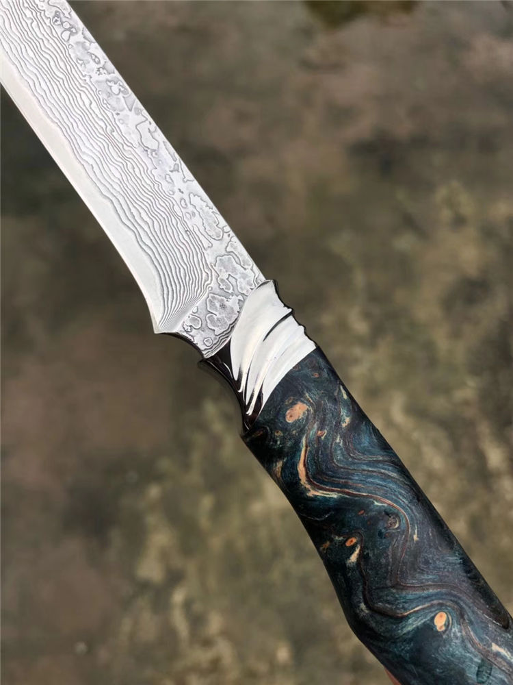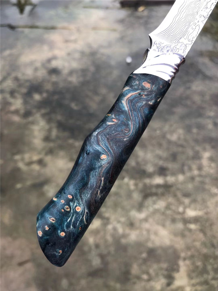 玲珑师作品之一,一款非常强势的猎刀VG10大马士革钢刃材制作,超级耐磨耐腐蚀,钢材韧性与防锈性保持度非常好,手柄/(稳定固化木材)青色火焰,瑰丽绚烂,充满了神秘的浪漫色彩