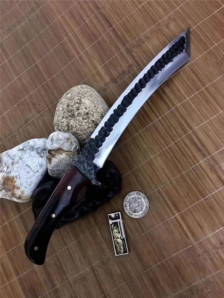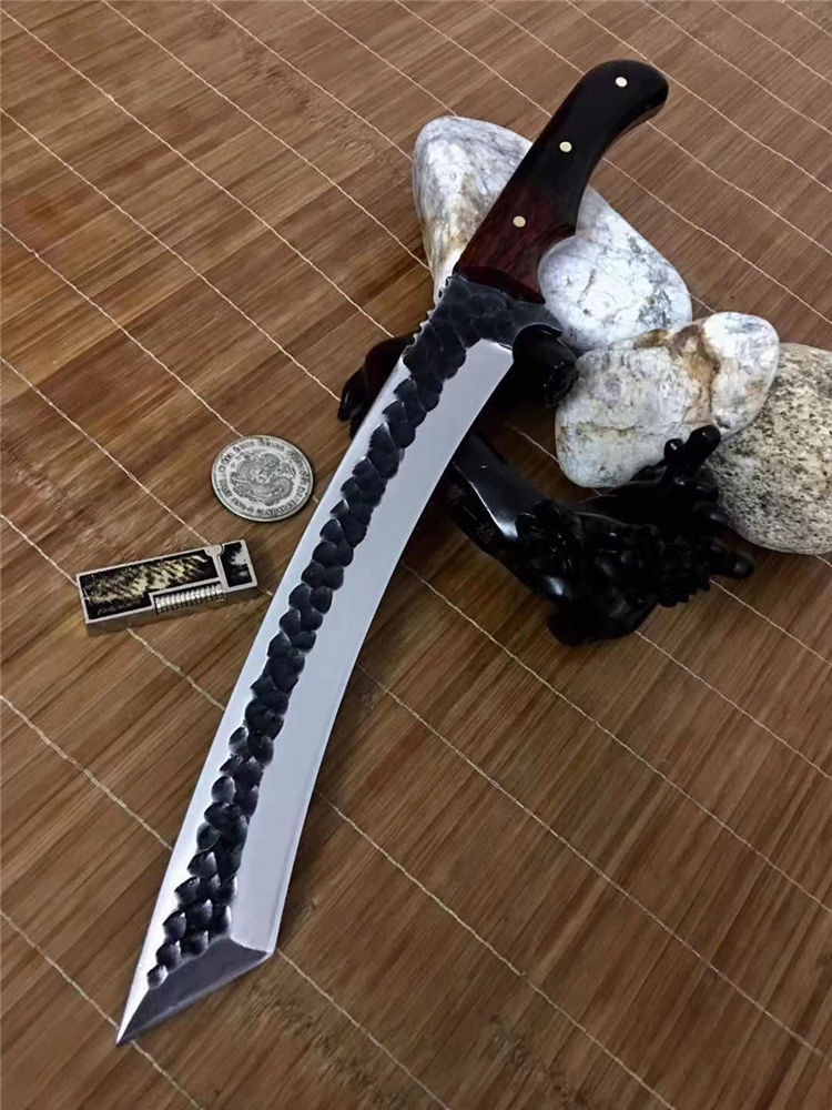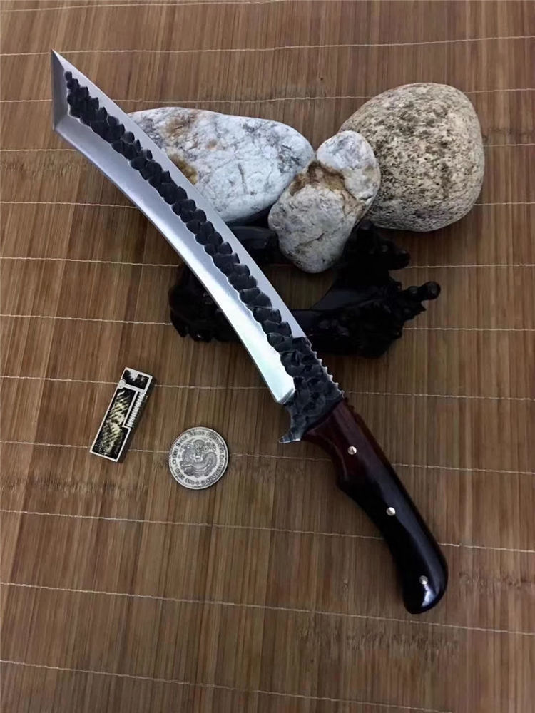 潘大师手工猛将开山刀 总长:45公分 刃长:30公分 刃长:30公分 备注:此刀无刀套 原锻师傅纯手工精心精细锻打户外猛将开山刀,刀口超级锋利硬度61度刀面采用古老手工锻打蛇鳞凹凸刀面进口国外高速钢两次淬火回火