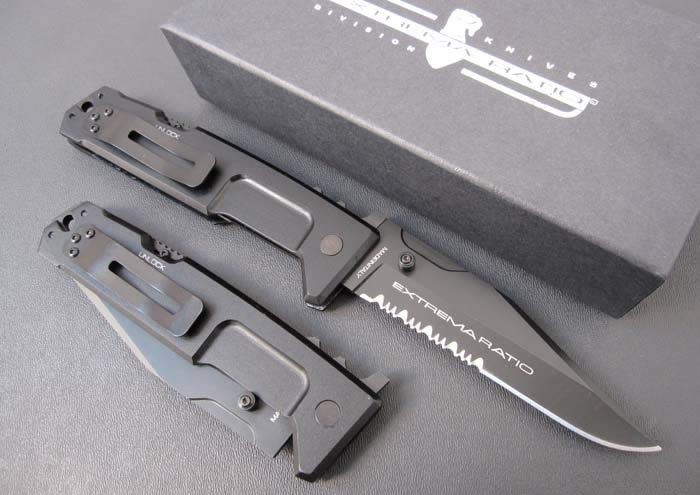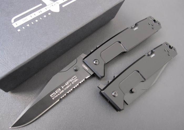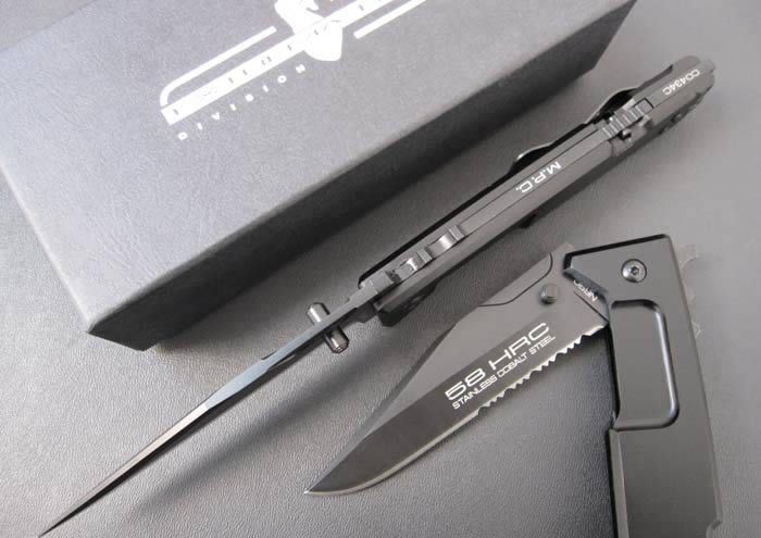 极端武力M.P.C.II(薄版) 全长:26cm 刃长:11cm 刃宽:3cm 刃材:440C 硬度:57-58 刃厚:0.4cm 涂层:黑钛 柄材:防腐处理手柄 6061-T6铝,黑色阳极电镀处理 净重:180克 总重:380克 锁闭:背锁.一经锁定,简直可以当直刀使用! 配搭;2个规格的内六角匙,作为刀具维护工具;带坚固背夹;原装纸盒。