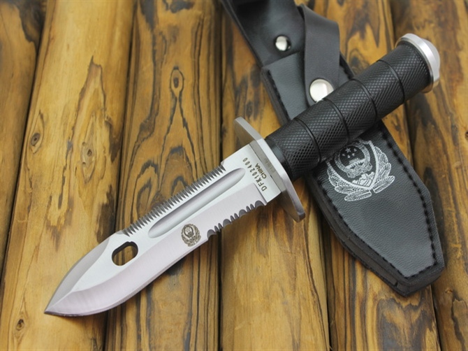 精仿迷你警用FK-1制式刀 型号:每一把有独特的流水号 全长:21cm 刃长:10cm 刃宽:2.5cm(最宽处) 柄长:10.5cm 刃材:440 硬度:57 表面:平磨砂光 刃厚:0.5cm 柄材:ABS工程硬胶(表面喷橡塑,手感舒适) 重量:250克 其他:刃口锋利,手柄尾部有玻璃撞针,真皮刀套