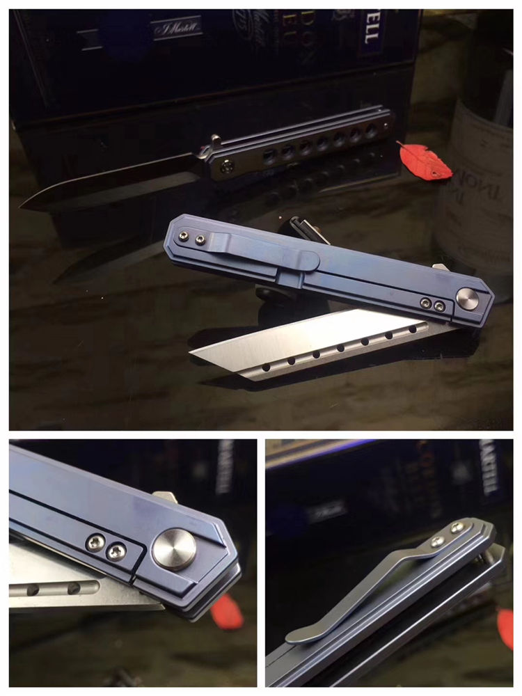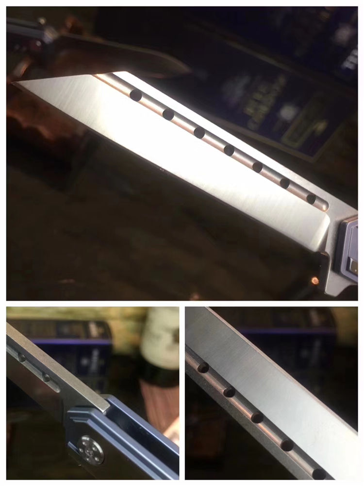 潜龙D2钛合金折刀 全长:21.5cm 刃长:9.5cm 刃宽:1.5cm(最宽处) 柄长:12cm 刃材:D2 柄材: TC4钛合金 硬度:59-61HRC 净重:95克 刃厚:0.4CM 利度:锋利 功能:家用、野外露营 包装:原装纸盒 适用范围:户外