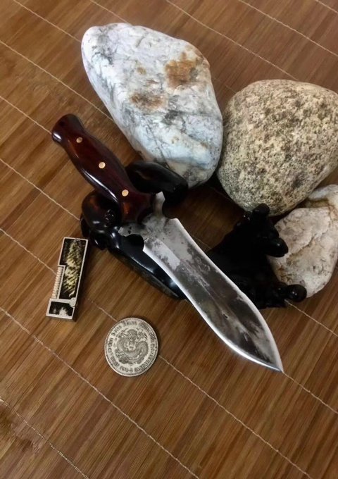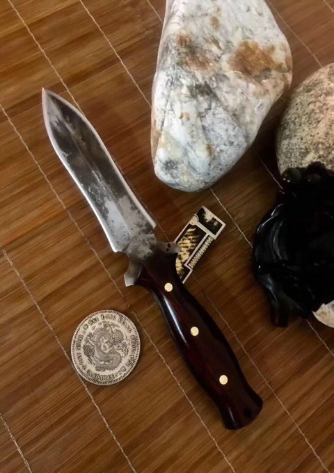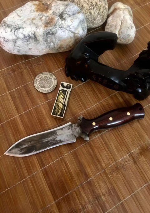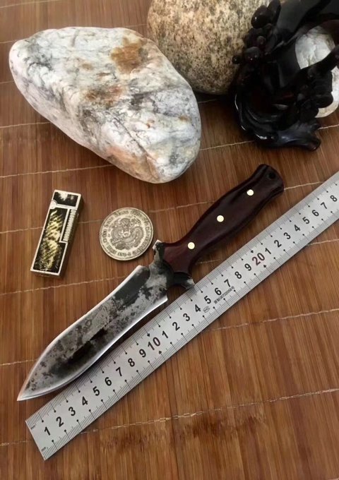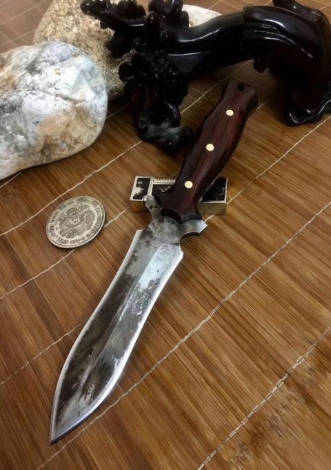 纯手工锻打水墨双刃没配刀套 总长:25.5公分 刃长:13公分 厚度:0.5公分 硬度:六十一 刃材料:进口俄罗斯高速钢精心锻造 原古老二次淬火、回火热处理 手柄:越南进口红酸枝木柄 此刀没有皮套(裸刀)