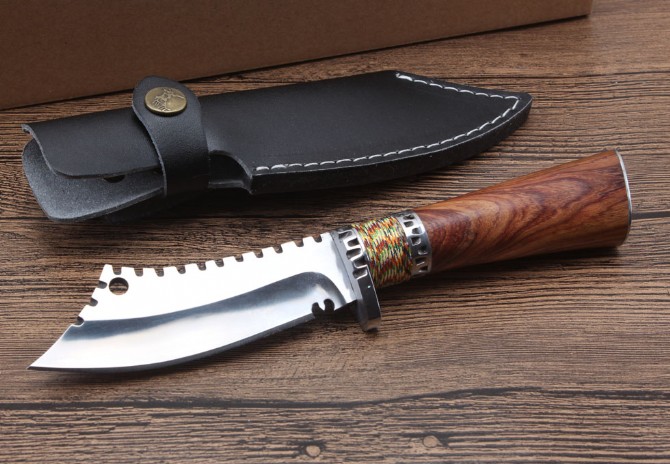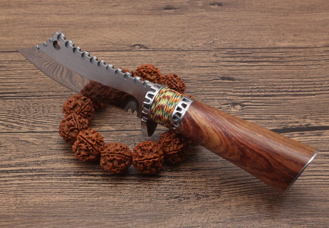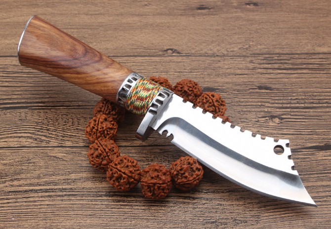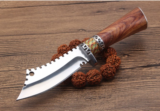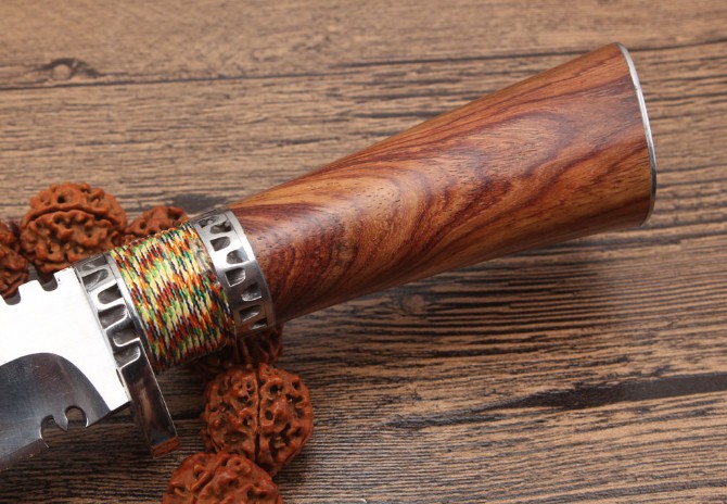 野战小开路刀 全长:22cm 刃长:10cm 柄长:12cm 刃厚:5.1mm 刃宽:4.0cm(最宽处) 刃材:5CR15MOV 硬度:57HRC 刀重:268克(含包装) 表面:镜光+拉丝 柄材:钢+佛珠彩线+非洲黄檀木 刀鞘:牛皮套+纸盒