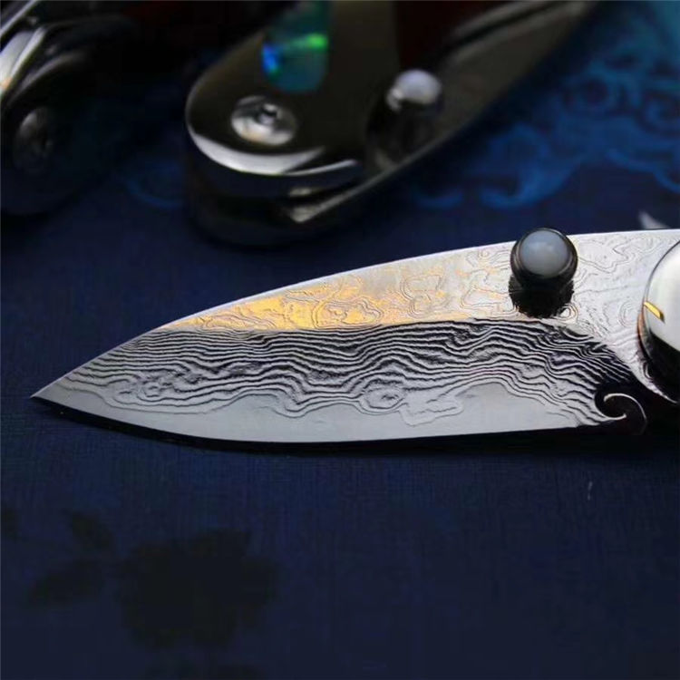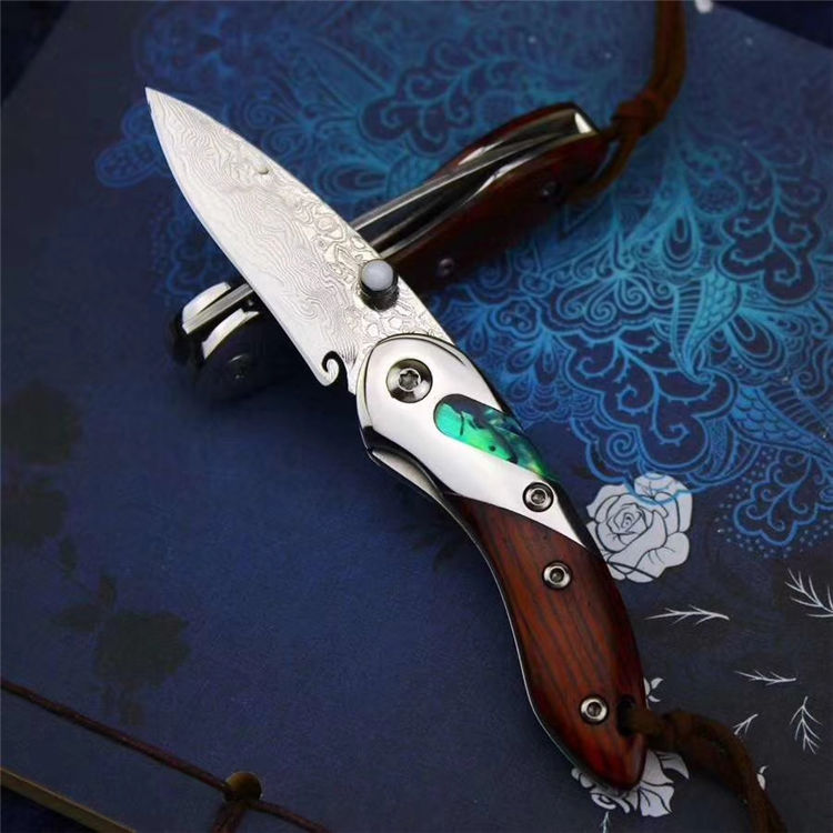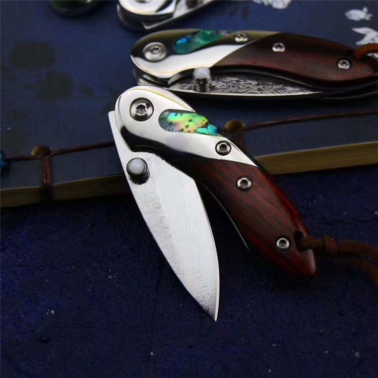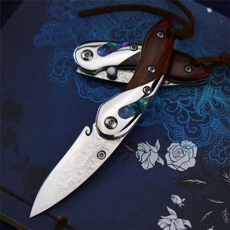 祥云纹鳍鱲小美鱼大马士革折刀 全长:12cm 刃长:5cm 闭合长:6.6cm 刃钢材:大马士革钢,祥云纹 刃厚:2.1mm 硬度:60HRC 柄材:镜面钢头+天然贝壳贝壳+微粒黄檀木 配件:精美礼品小盒+小绒布袋 小鱼儿般外观设计,大马士革钢刀刃,花纹流水行云,梅花刃头,显得姿态活跃,刀柄特色精工镶嵌/天然鲍鱼彩贝壳,如七彩缤纷的鳞片、搭配微粒黄檀木,都说鱼儿记忆只有7秒,而它,永远都在为它的后七秒做准备