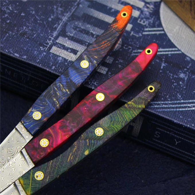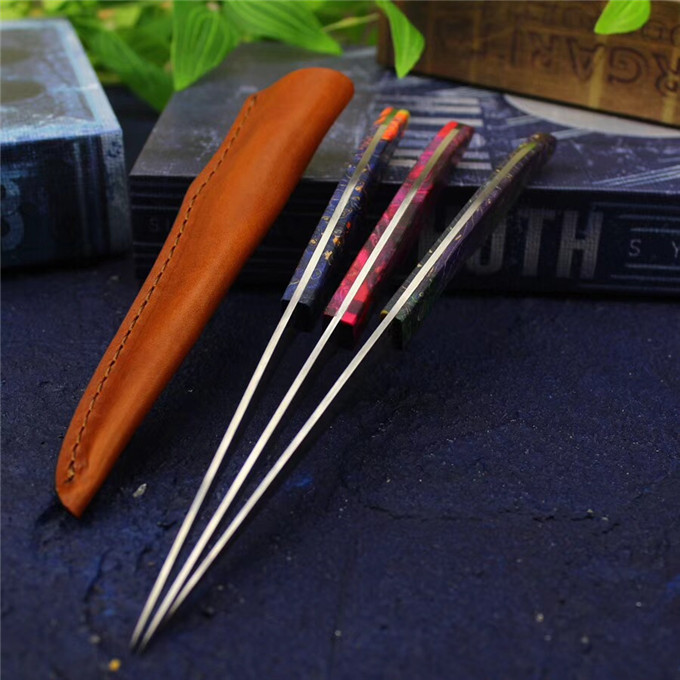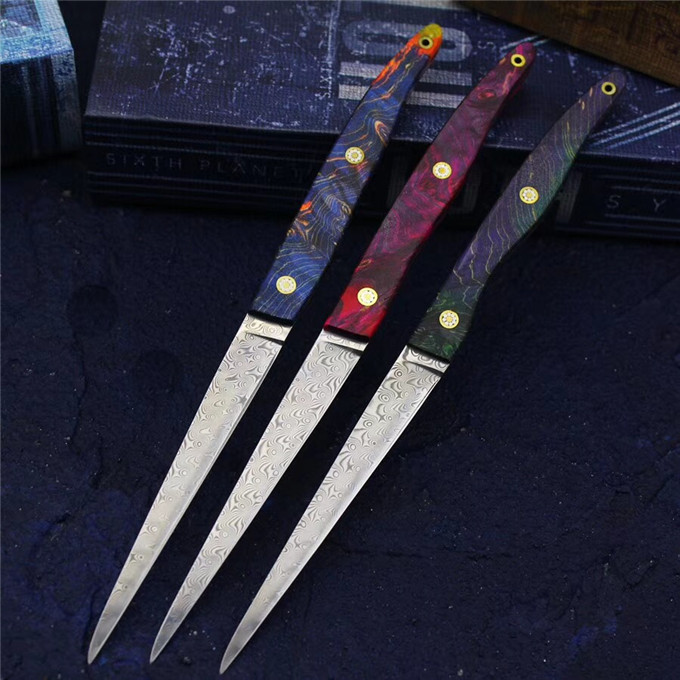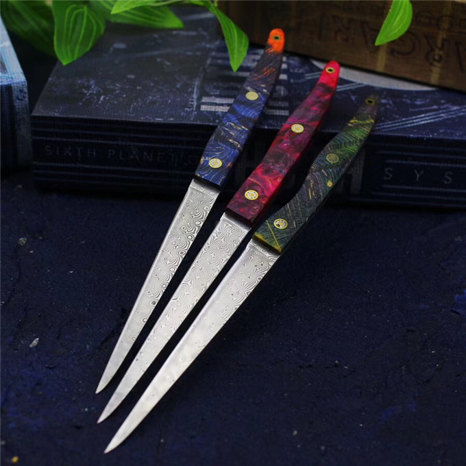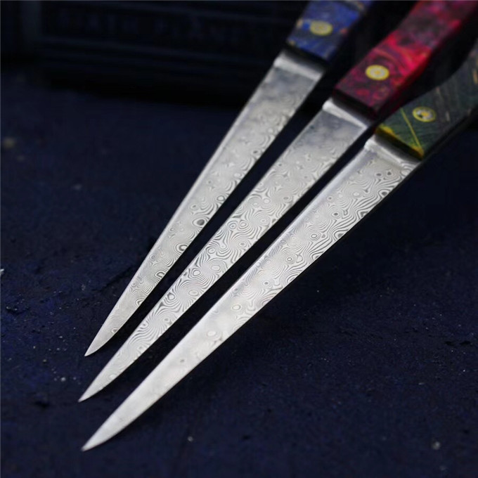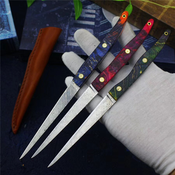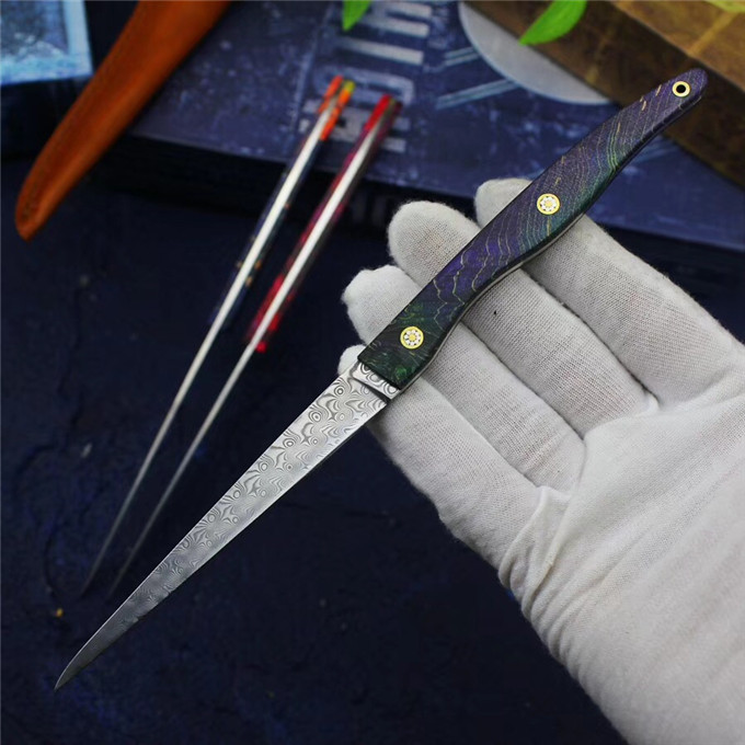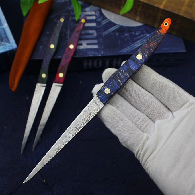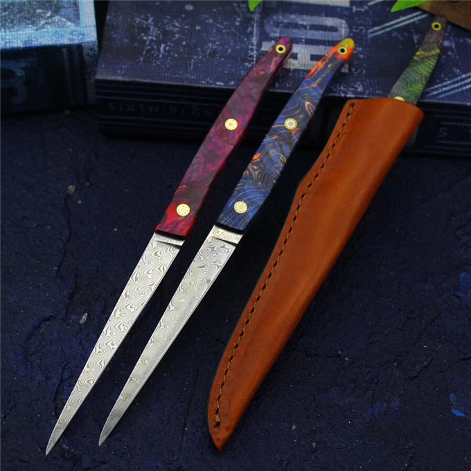 大马士革鱼刀 总长:21cm 刃长:10cm 手柄长:11cm 刃厚度:2mm 刃钢材:进口大马士革钢(螺旋纹) 硬度:60HRC 手柄材料:固化稳定木 净重:32g 包装配件:手工制作牛皮套+高级盒 纯手工开刃、非常锋利无比,家居水果刀