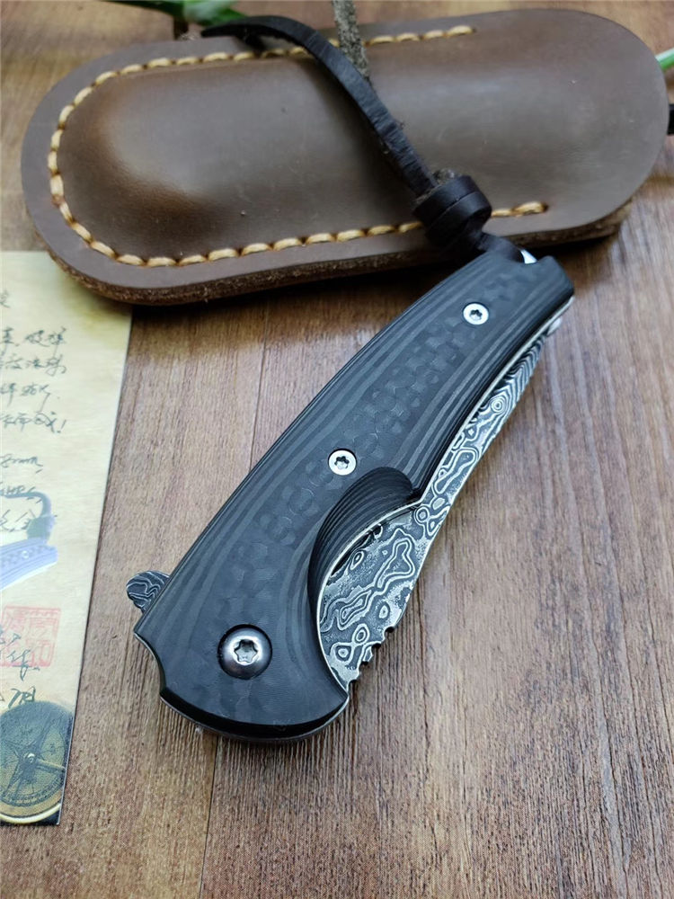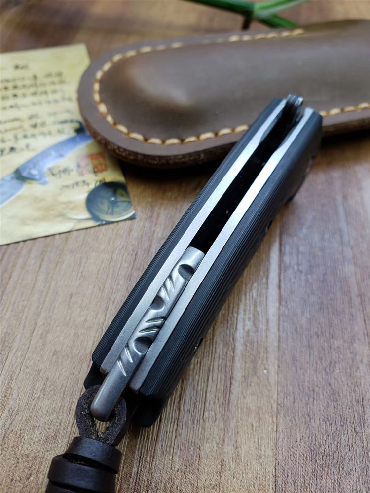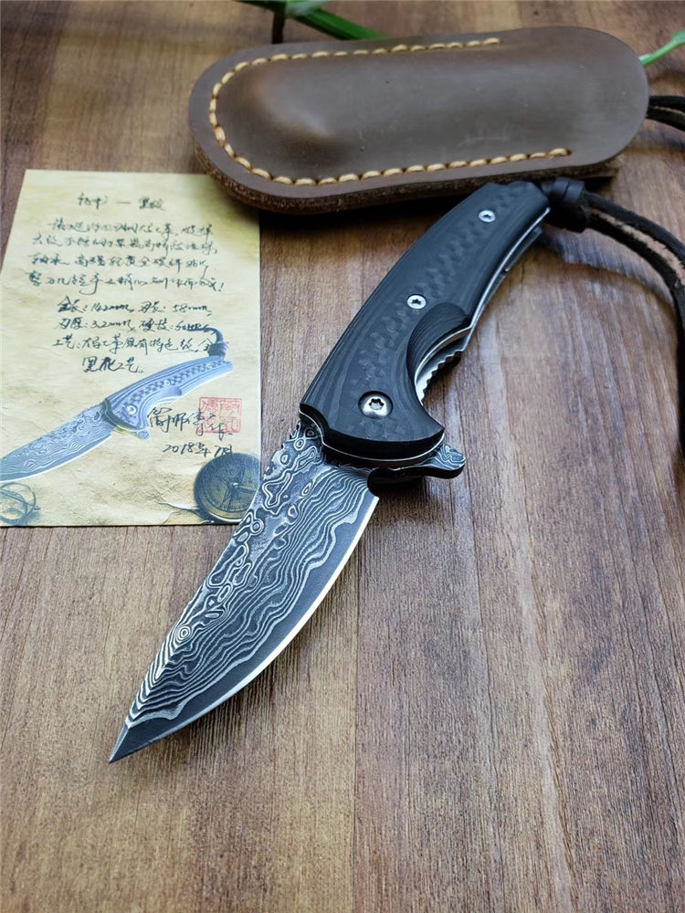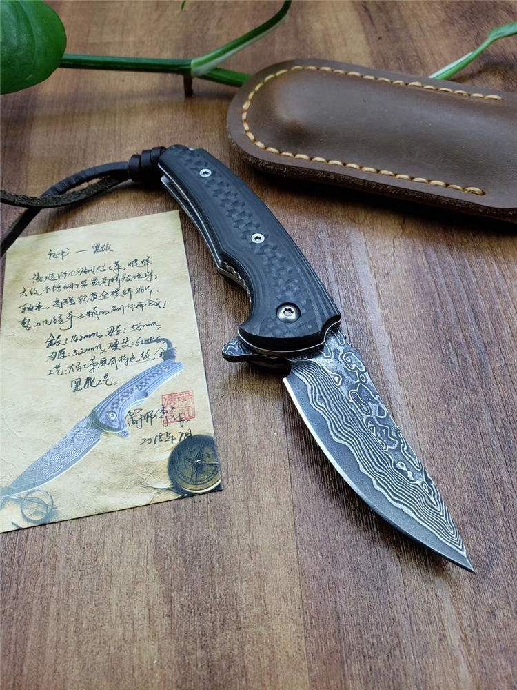 黑狼简师傅作,此款随身小刀选用高强轻质全碳纤刀柄,刀刃VG10刃钢大马士革锻打祥云纹,不锈钢刀架镶嵌高精度滚珠轴承,一体快开设计,底骨手工锉花,配头层牛皮手工缝制皮套,赠送简师傅收藏证书,复古礼盒包装