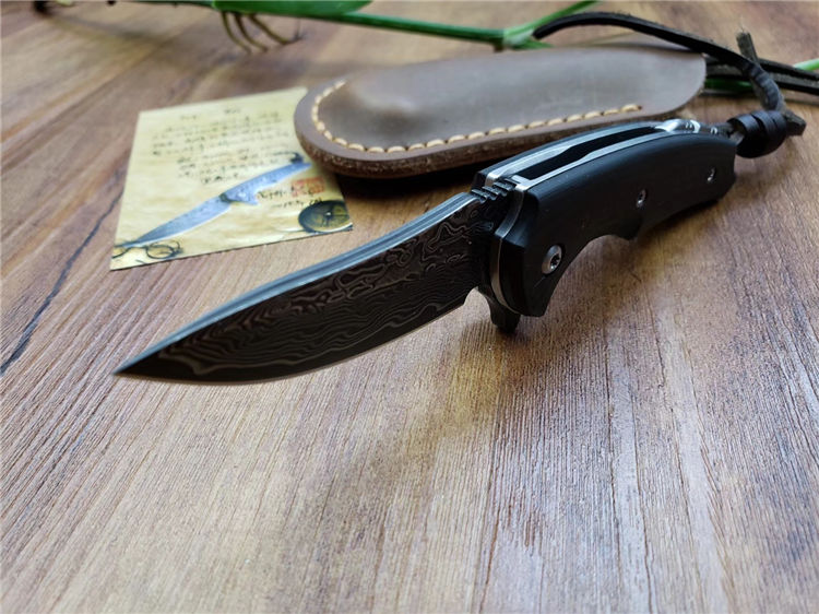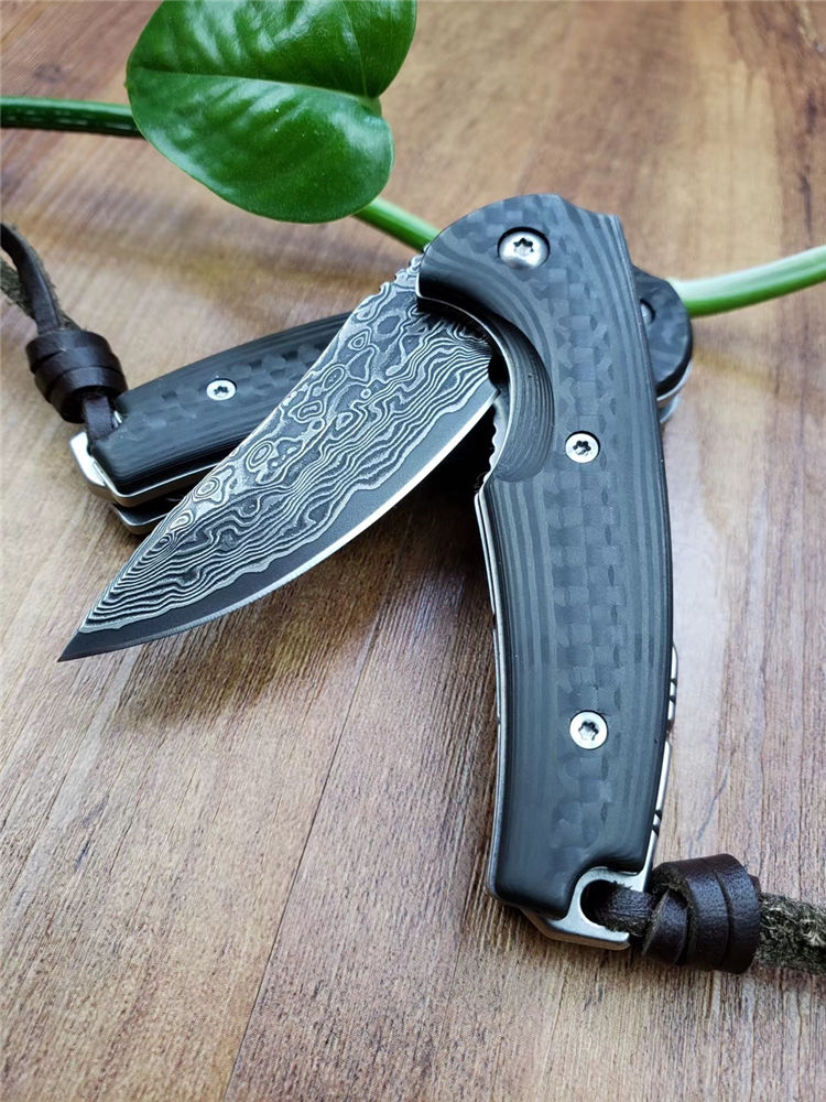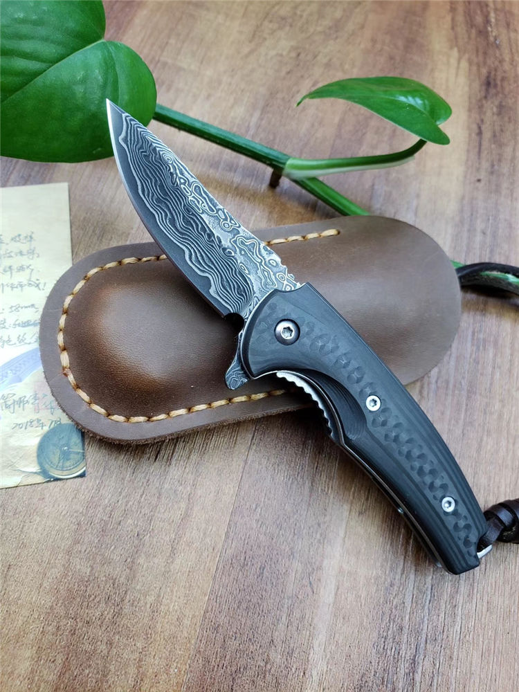 简师傅黑狼大马士革折刀 全长:14.2cm 刃长:5.8cm 刃厚:3.2mm 硬度:60HRC 黑狼整体小巧强悍,随身携带方便,是一款随身必备物品 黑狼简师傅作,此款随身小刀选用高强轻质全碳纤刀柄,刀刃VG10刃钢大马士革锻打祥云纹,不锈钢刀架镶嵌高精度滚珠轴承,一体快开设计,底骨手工锉花,配头层牛皮手工缝制皮套,赠送简师傅收藏证书,复古礼盒包装