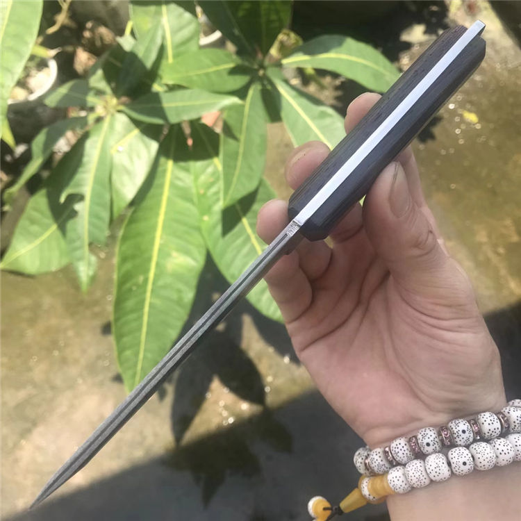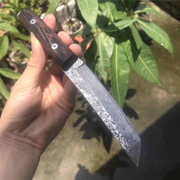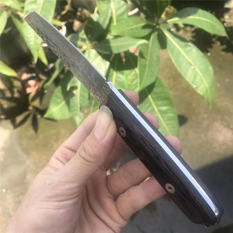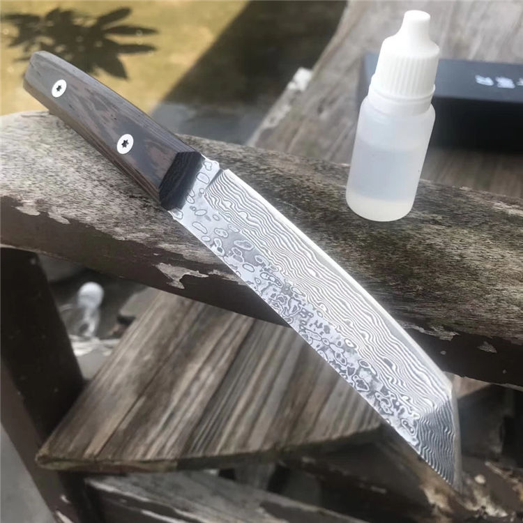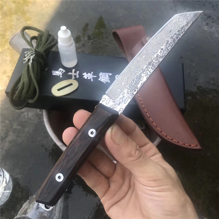 鸡翅木手柄可随意拆卸,还可以Diy加铜护手防滑绳缠绕手柄,满足Diy发烧友,把玩骨灰级宝贝噢,该刀彩用顶级大马士革钢重本打造,锻打雨滴水波花纹朵朵饱满,进口鸡翅木镶大马士革龙骨一体手柄,资深老师傅纯手工打磨,刀刃经过高温热处理工艺二次开刃,特别锋利,能轻易括毛剃胡子削纸过水瓶轻松搞定,是收藏送礼户外狩猎把玩馈赠亲友之精品,喜欢快来