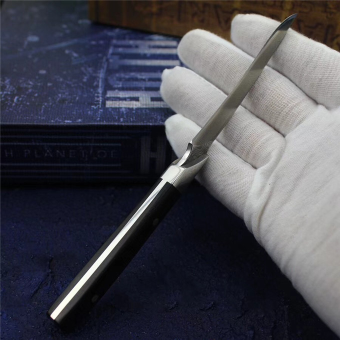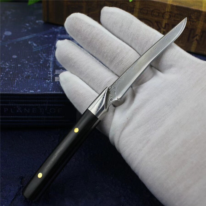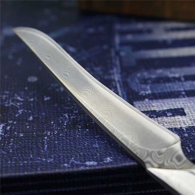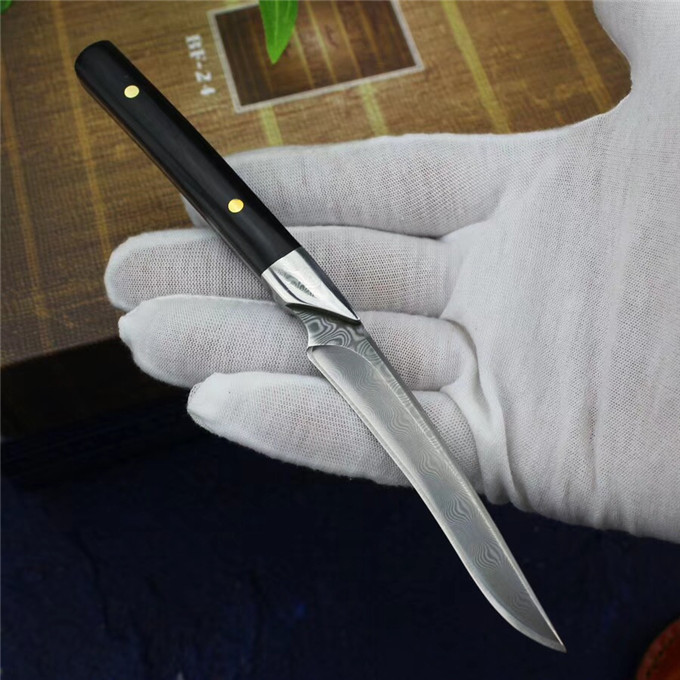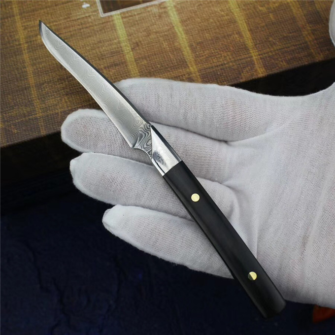 小型手工刀,采用锻打大马士革钢无钢芯层制造,花纹天然而成,大马士革手柄钢头+黑檀木柳钉固定,纯手工小刀