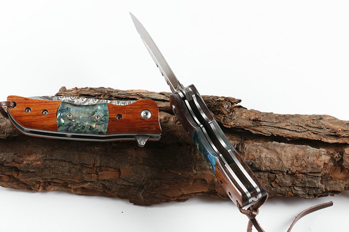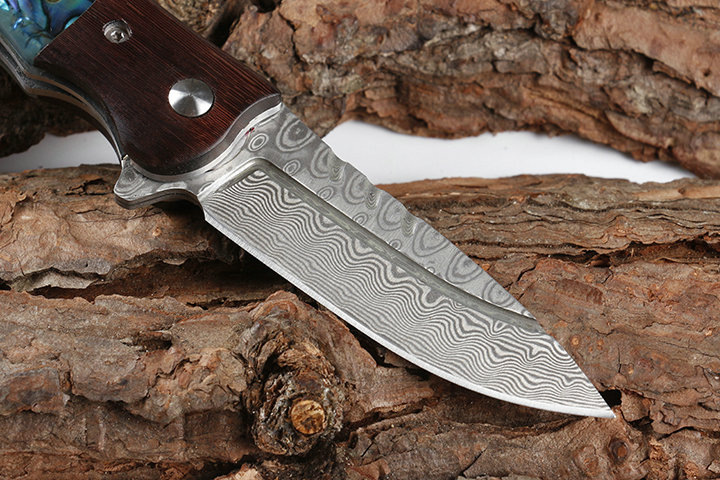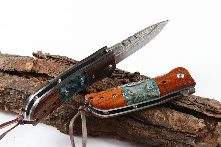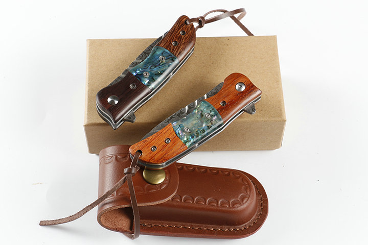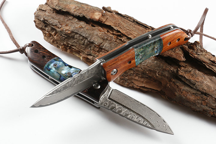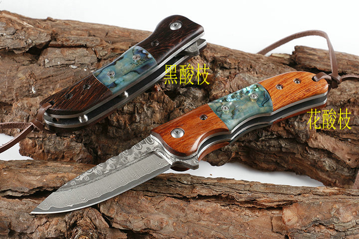 大马士革绝代双娇折刀 品名:大马士革 全长:17cm 刃长:7.5cm 柄长:9.5cm 刃宽:2.3cm 刃厚:3.3mm 刃材:VG10大马士革 重量:200g(含包装) 硬度:57-58HRC 表面:大马士革原有纹 柄材:天然鲍贝和(黑酸枝木+花酸枝林)两款式,下单请备注下. 锁型:侧锁,内轴承,开刀更流畅 其他:礼品盒+真皮套