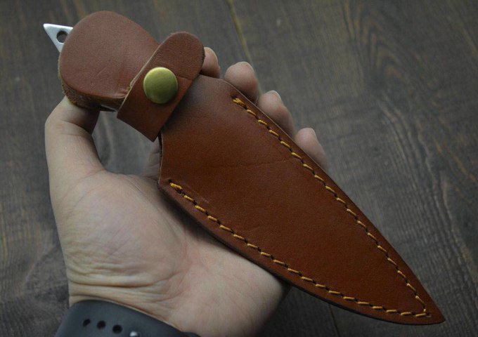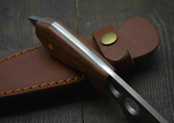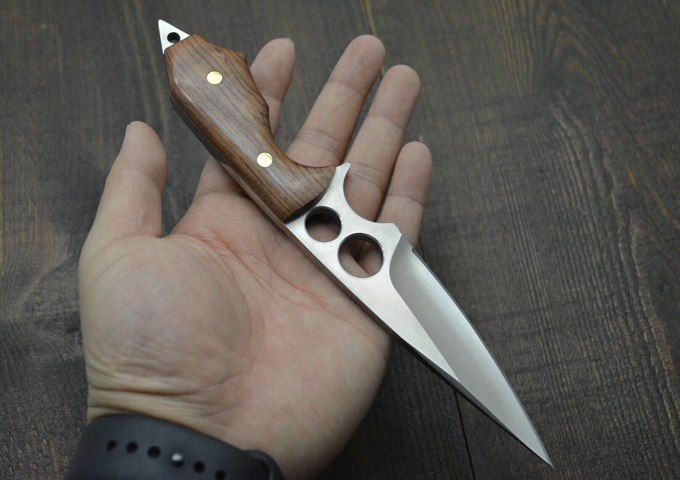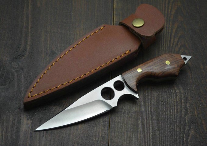 新品二孔战术直刀 全长:220MM 刃长:88MM 柄长:80MM 刃厚:5MM 刃宽:3MM 刃材:D2 柄材:酸枝木 硬度:60HRC 净重;230克(含包装) 其他:牛皮套