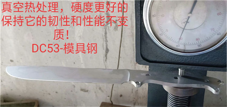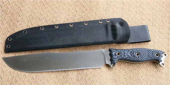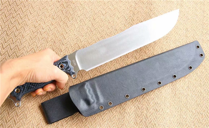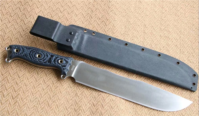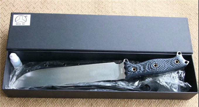 博尔特巴斯魔甲砍刀 全长: 415mm 刃长: 269mm 柄长: 145mm 刃宽:50mm 刃厚:6.8mm 刃面:砂光,拉丝二次抛腊光 类型:以锋利度,重砍度,韧性保持度最出色 开刃方式:数控V磨,三次开刃 刃材:DC53磨具钢(线切割开料) 热处理:真空淬油深冷热处理 硬度:60-61HRC 柄材:黑白米卡塔+8mm钢管CNC成型防滑纹 包装:精美黑纸盒+护刀油+伞绳 净重:680克 刀鞘:配置美国进口鞘板K鞘,K夹