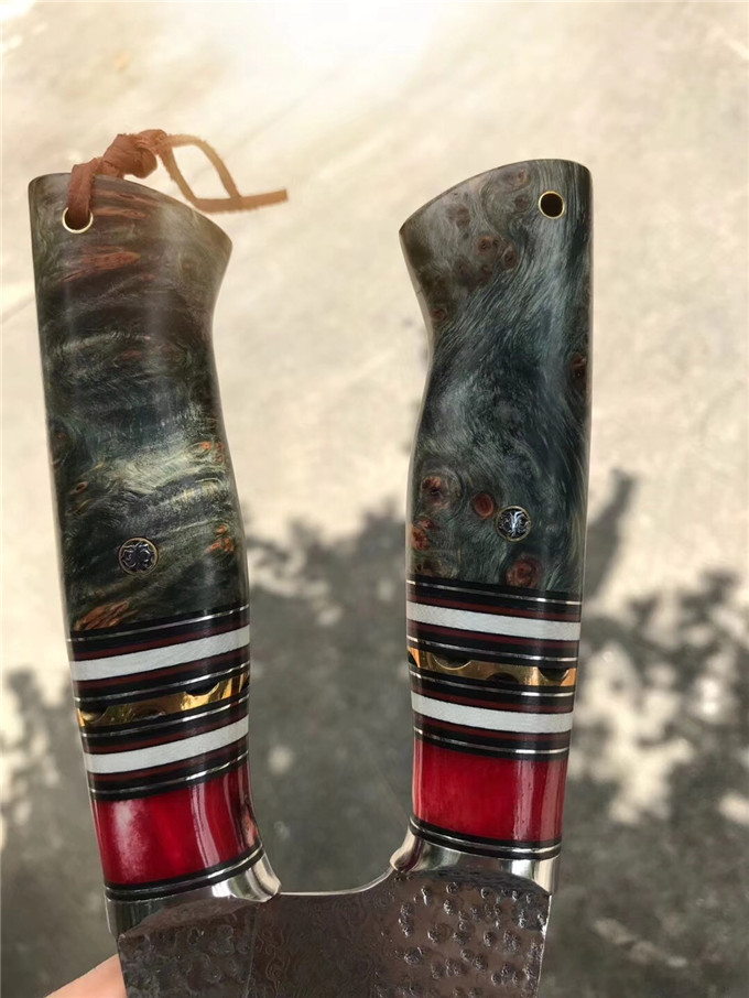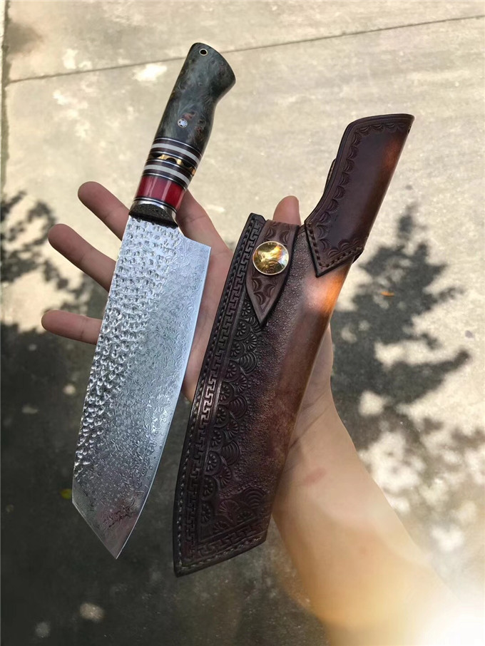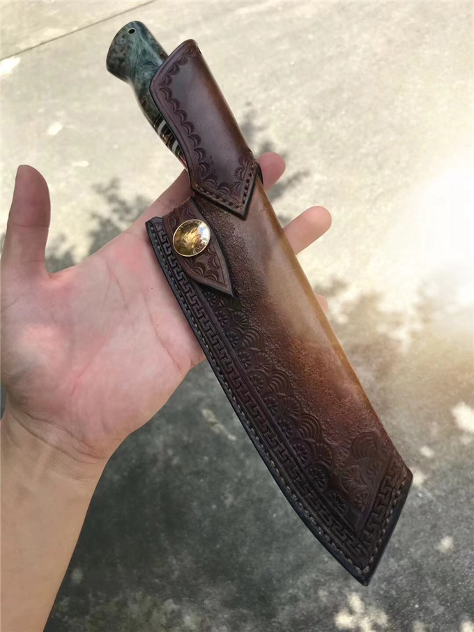 大马士革出口日式三德厨刀 总长:31cm 刃长:18cm 刃厚:2.0mm 刃宽:5.2cm 钢材:由日本客户提供当地VG10手工锻造钢材,67层,真空热处理 硬度:59-61HRC 柄材:稳定化木+G10+牛骨+铜片,收工打磨 皮套:阿根廷进口优质值鞣皮纯手工缝线雕花制作,每一个都是独一无二 包装:高档手工盒子包装