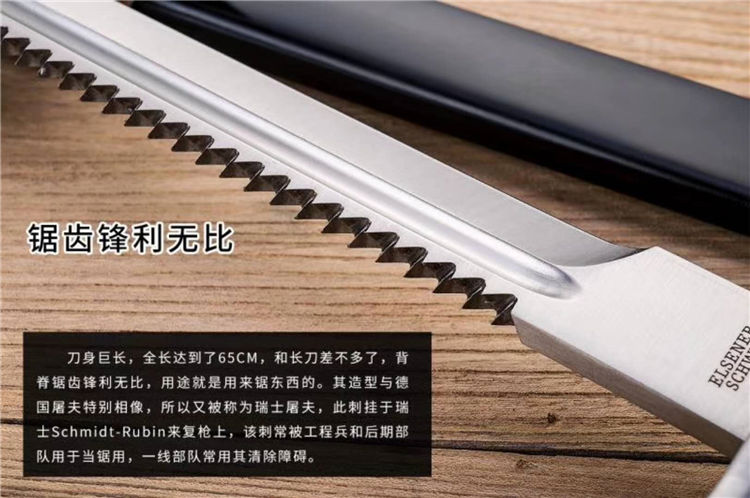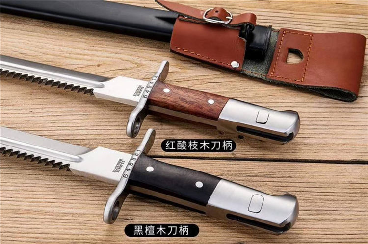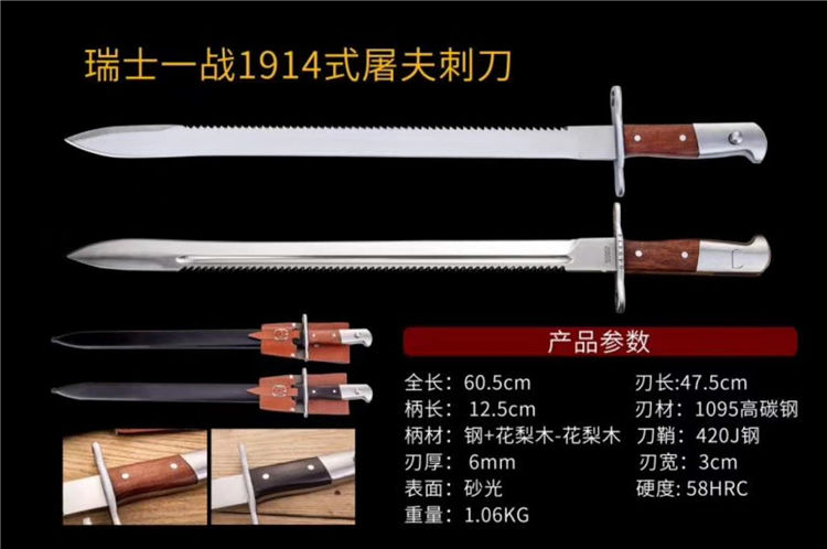 一战瑞士1914式屠夫刺刀 全长:60.5cm 刃长:47cm 柄长:12.5cm 刃材:1095高碳钢 柄材:钢+红酸枝木-黑檀木(下单注明) 刀鞘:420J钢 刃厚:6MM 刃宽:3MM 表面:砂光 硬度:58HRC 重量:1006g 一战屠夫刺刀,刀如其名!凶悍无比,比枪炮更有威慑力!即使被枪炮干死,也没有人愿意死于屠夫刀下! 瑞士1914刺刀,一战原品一比一复刻,百分百还原细节 ,钢质之精良足以傲笑古今! 瑞士屠夫刺刀,刀刃端部肥大,适合砍劈。被称为“屠夫之刃”的就是这款刺刀
