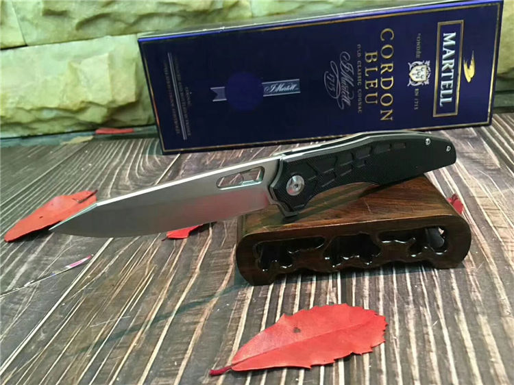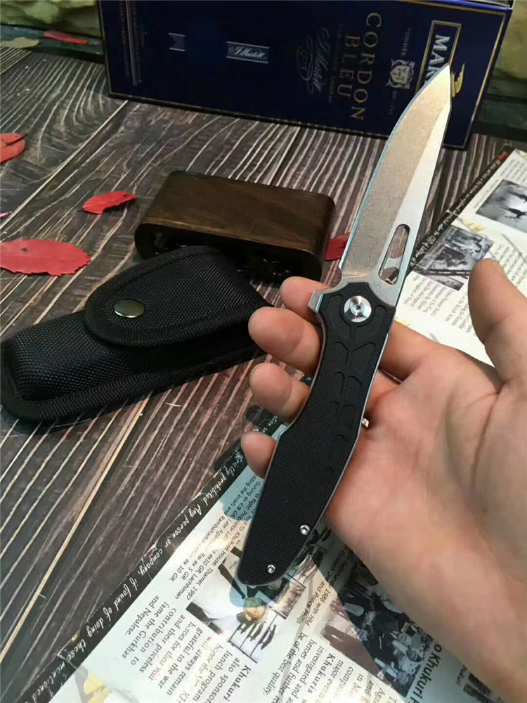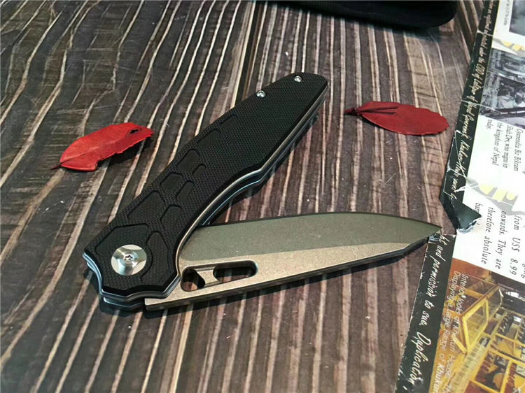 五步蛇轴承快开折刀 全长:21.5cm 刃长:9.0cm 柄长:12.5cm 刃宽:2.7cm 刃厚:2.9mm 刃材:440C 重量:140g(含包装物) 硬度:57HRC 表面:沙光处理 柄材:钢片+G10 锁型:线锁 其他:配彩盒