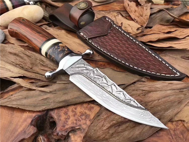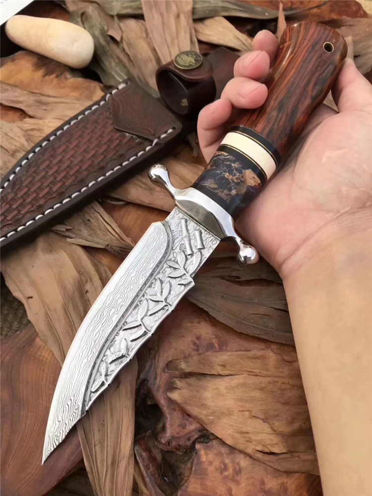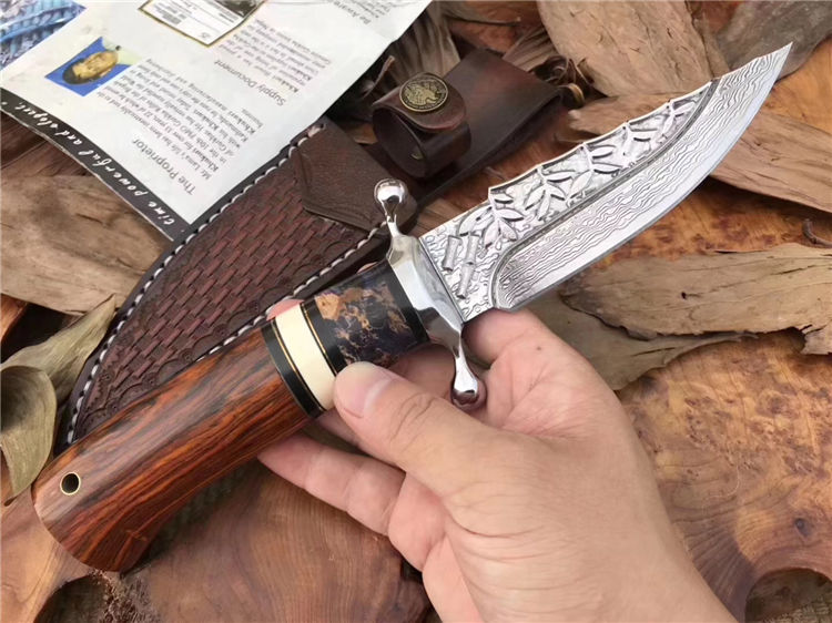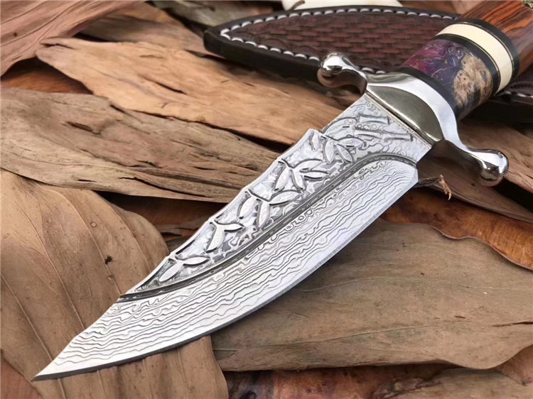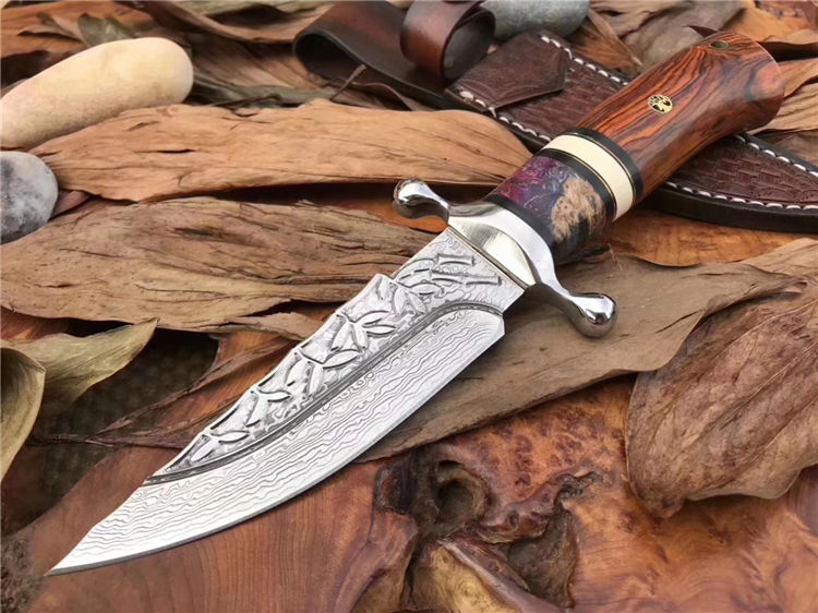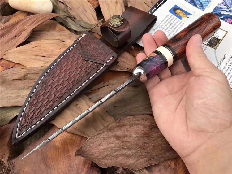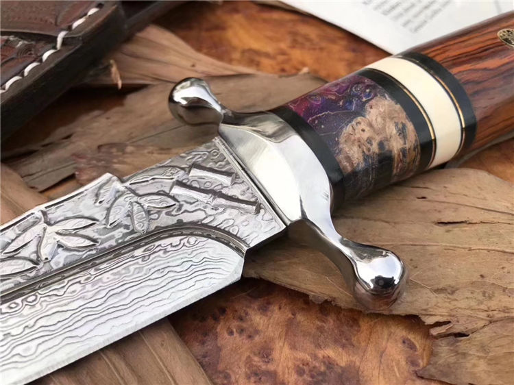 大马士革竹仙直刀 全长:27cm 刃长:13.5cm 柄长:13.5cm 刃最宽处:3.8cm(最宽处) 刃材:高硬度大马士革VG10钢 硬度:59-60HRC 柄材:稳定固化颜色木+黄檀木 手工缝制精致皮套采用高端稳定固化颜色木+黄檀木手柄、大马士革VG10钢心,手工缝制精致皮套